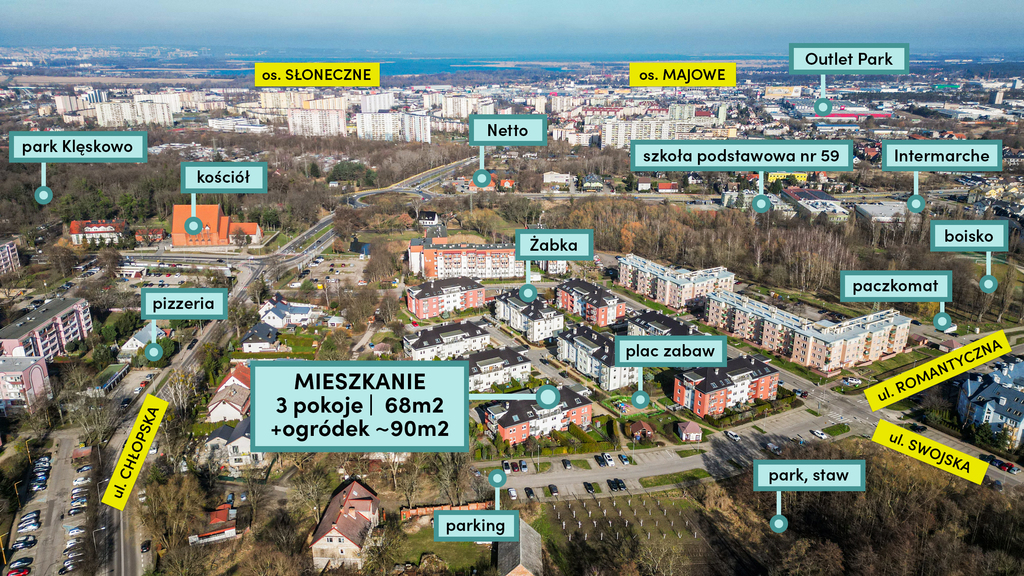 W okolicy m.in.: Żabka, poczta, pizzeria, place zabaw; dalej Netto, Intermarche, Biedronka szkoły, boisko. Do pętli autobusowej (Słoneczne lub Bukowe) 10 minut piechotą, do Outlet Parku 5 minut samochodem. Ścieżki rowerowe, Puszcza Bukowe i jej wszelkie walory na wyciągnięcie ręki.