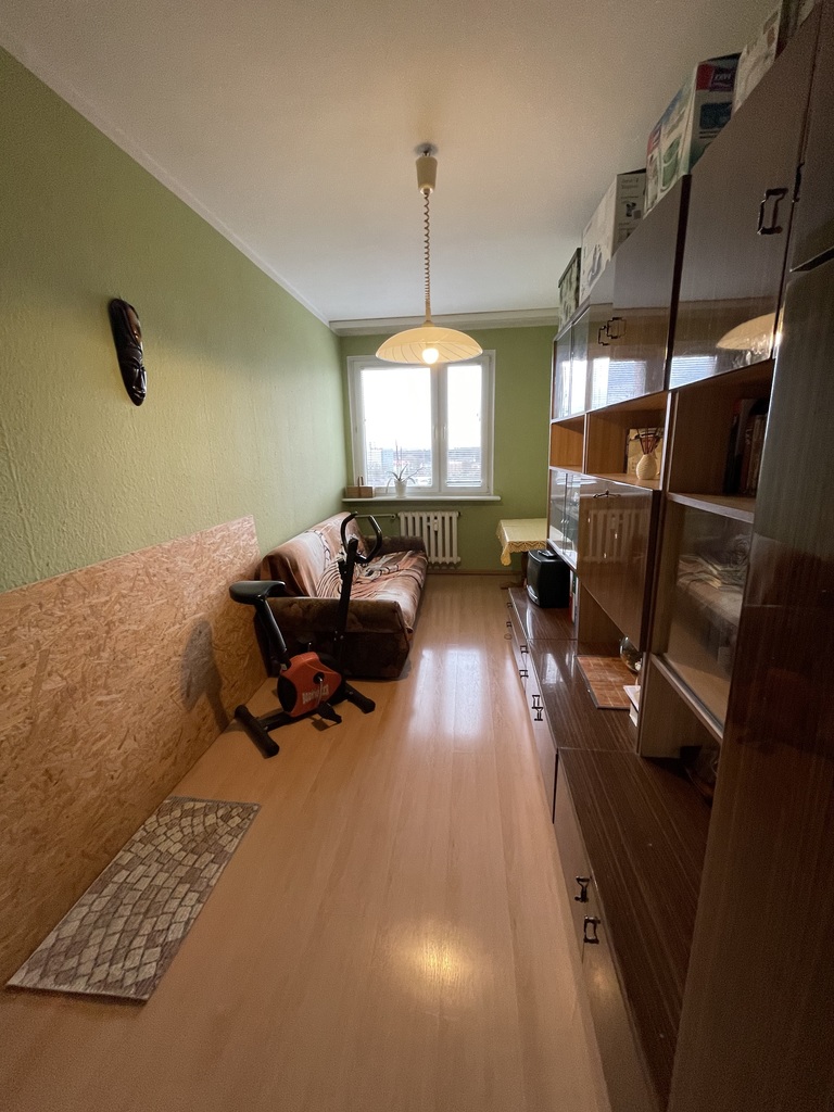 Ściany wygładzone, panele w bardzo dobrym stanie, mieszkanie czyste i zadbane.