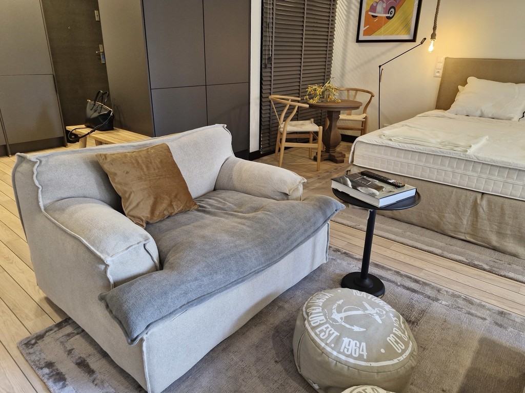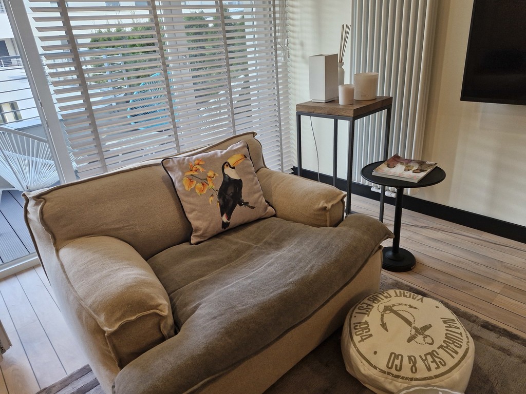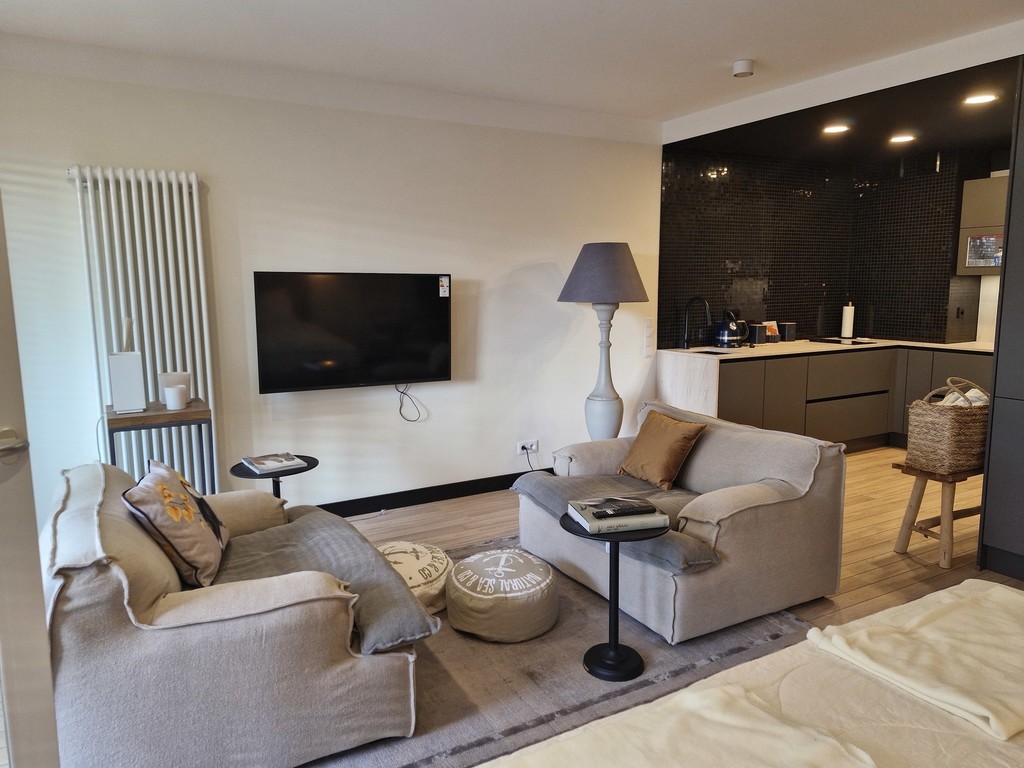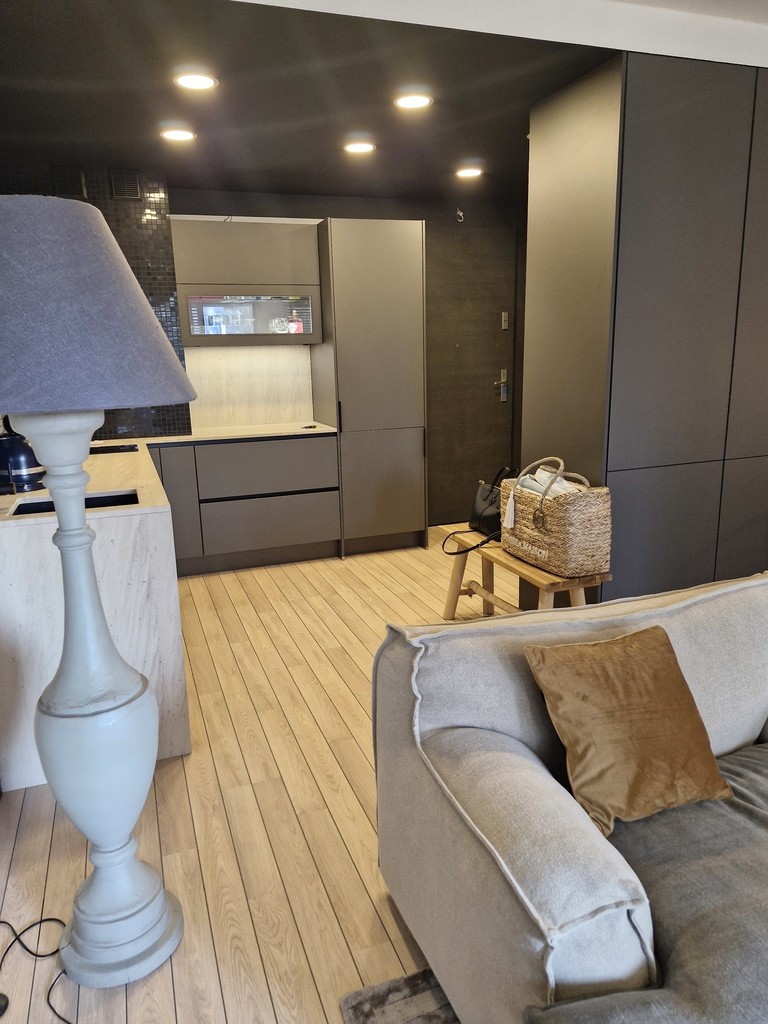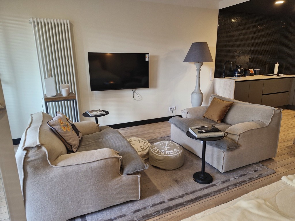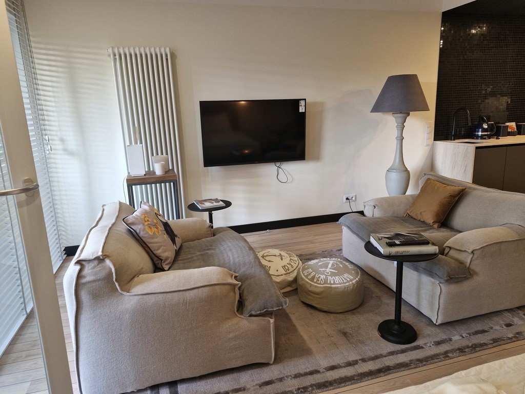 Ten wyjątkowy designerski apartament został zaprojektowany z dbałością o najdrobniejsze szczegóły. Pokój dzienny w gustownych stonowanych kolorach łączy się z aneksem kuchennym w kolorze szarym z gustowną czernią. W salonie znajdują się meble z ekskluzywnej renomowanej pracowni architektonicznej  " Maisonde Rome Interior  Desige" z litego drewna oraz kanapy w wyjątkowym gustownym odcieniu beżu.