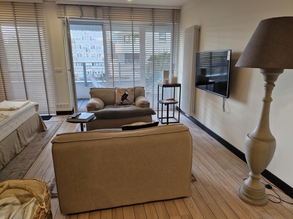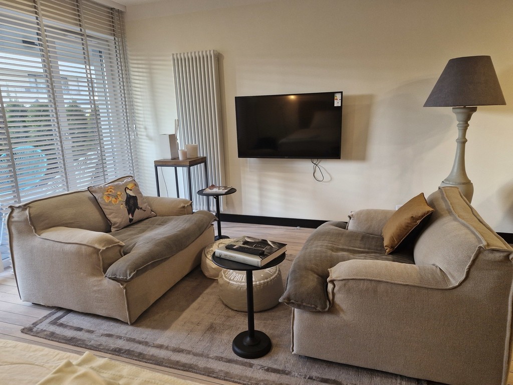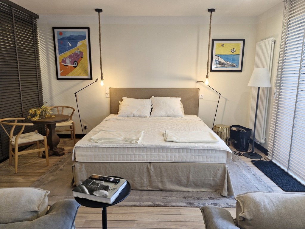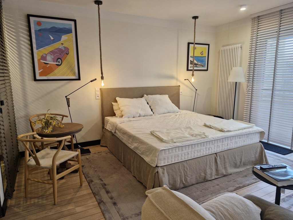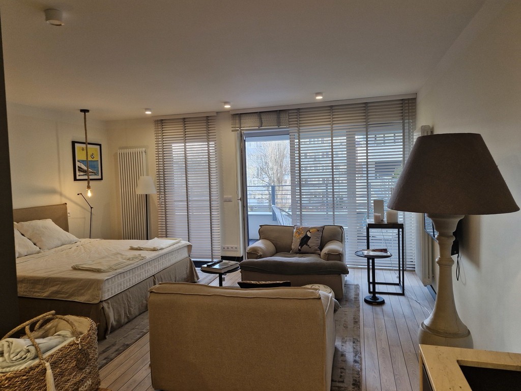 Ten wyjątkowy designerski apartament został zaprojektowany z dbałością o najdrobniejsze szczegóły. Pokój dzienny w gustownych stonowanych kolorach łączy się z aneksem kuchennym w kolorze szarym z gustowną czernią. W salonie znajdują się meble z ekskluzywnej renomowanej pracowni architektonicznej  " Maisonde Rome Interior  Desige" z litego drewna oraz kanapy w wyjątkowym gustownym odcieniu beżu.