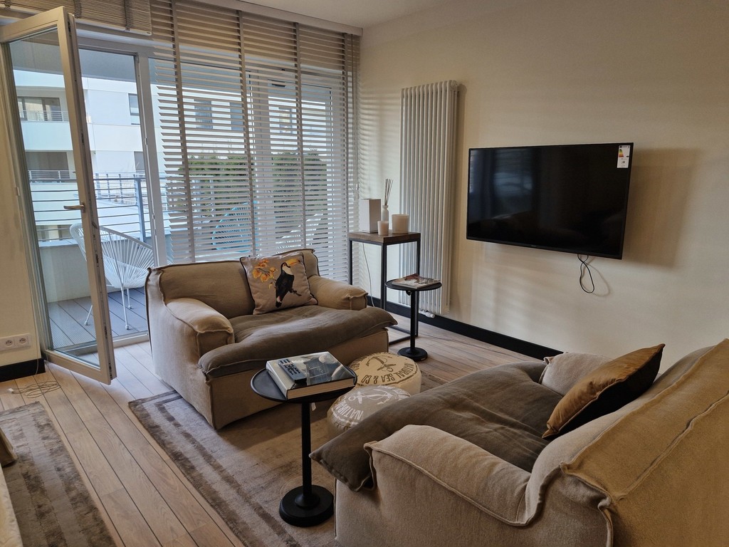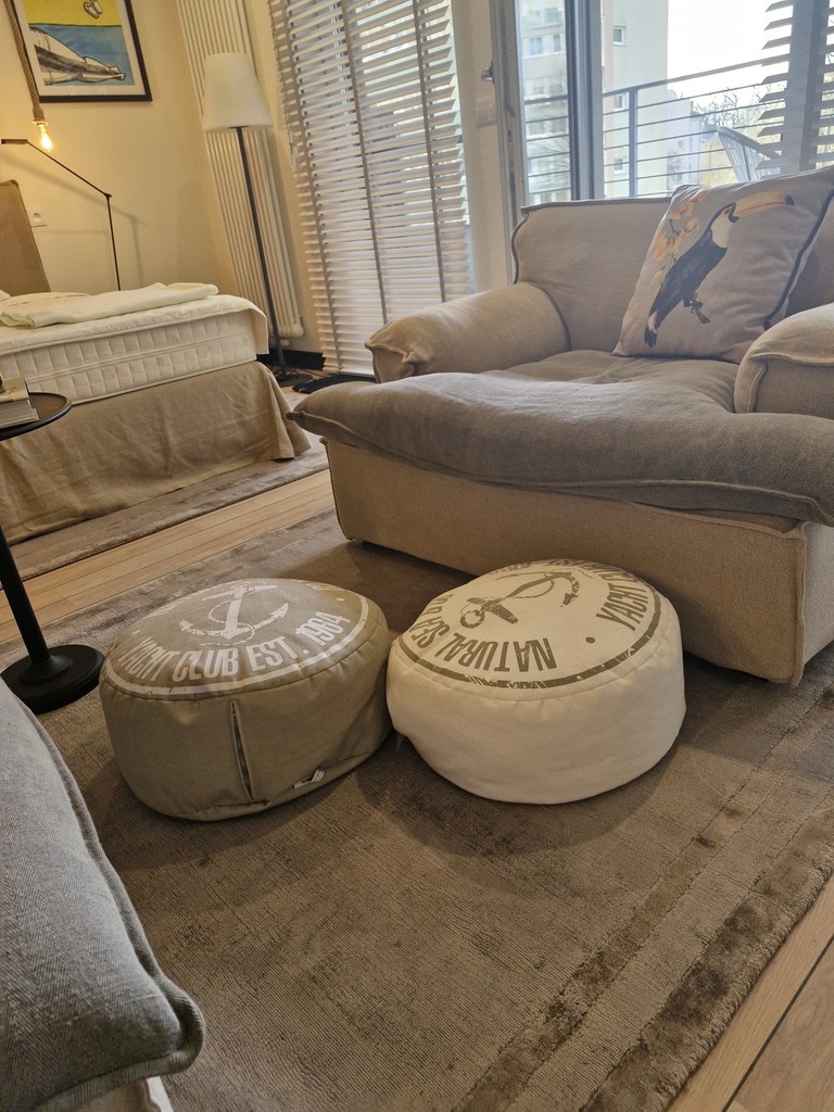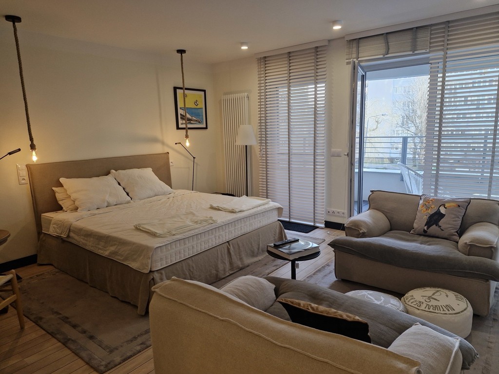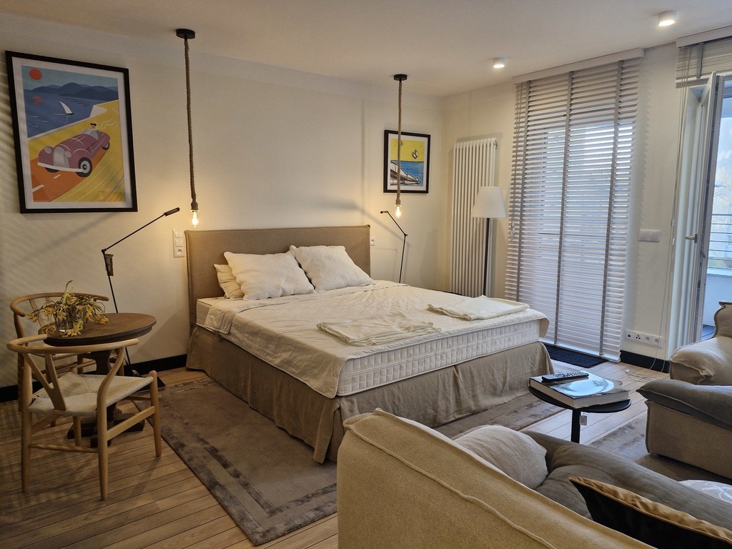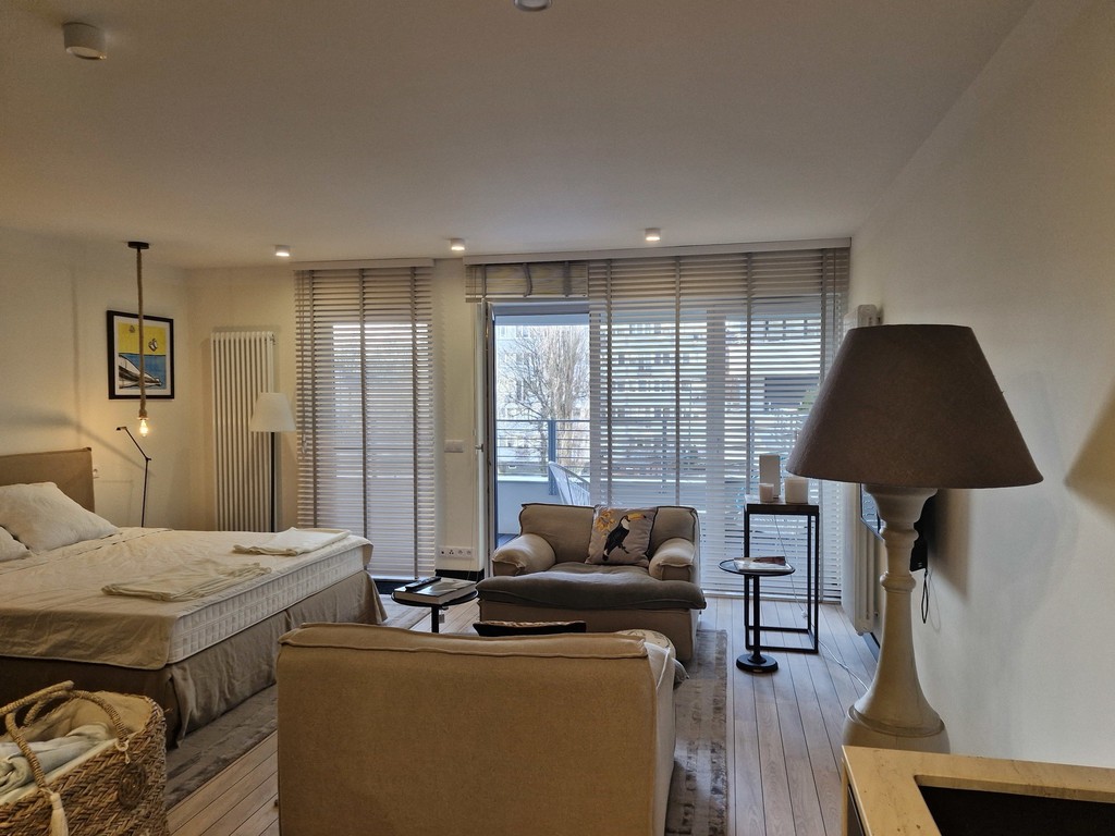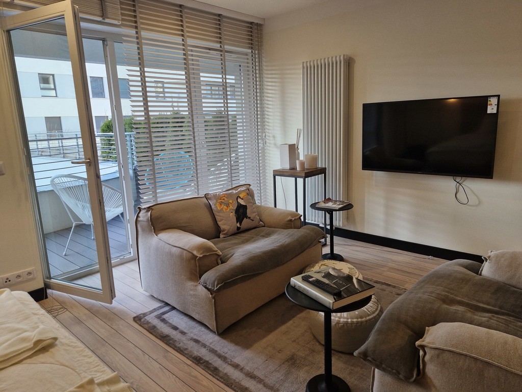 Ten wyjątkowy designerski apartament został zaprojektowany z dbałością o najdrobniejsze szczegóły. Pokój dzienny w gustownych stonowanych kolorach łączy się z aneksem kuchennym w kolorze szarym z gustowną czernią. W salonie znajdują się meble z ekskluzywnej renomowanej pracowni architektonicznej  " Maisonde Rome Interior  Desige" z litego drewna oraz kanapy w wyjątkowym gustownym odcieniu beżu.