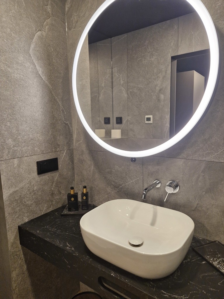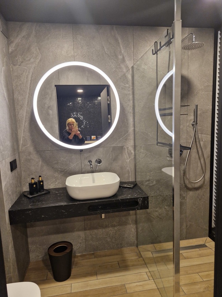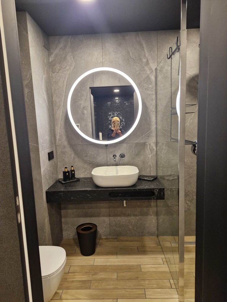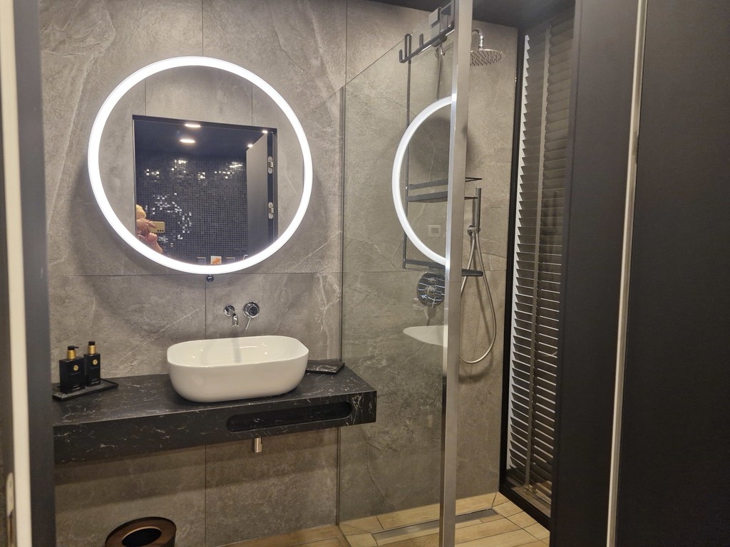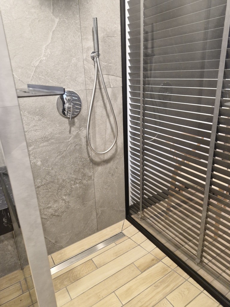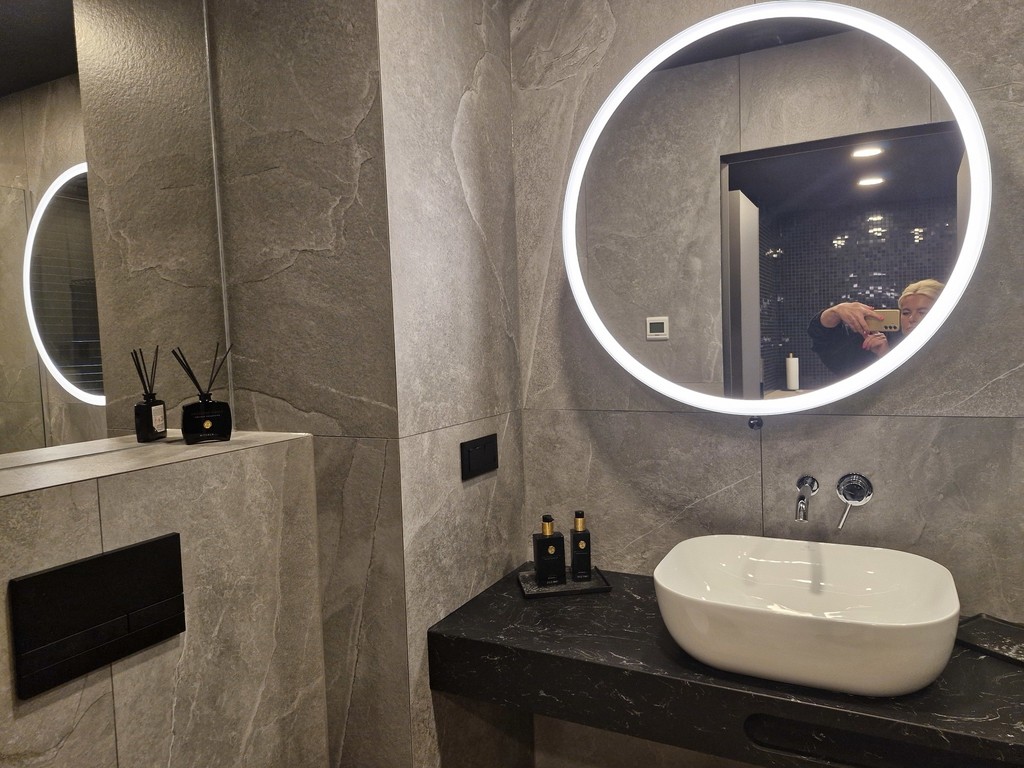 Łazienka jest również designerska tak jak cały apartament. Szare gustowne kafle świetnie komponują z jasną podłogą. Ledowe lustro, które jest wysuwane nadaje łazience wyjątkowego charakteru. W kabinie prysznicowej zastosowano najmodniejszy odpływ liniowy.