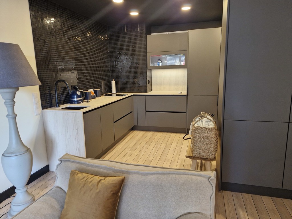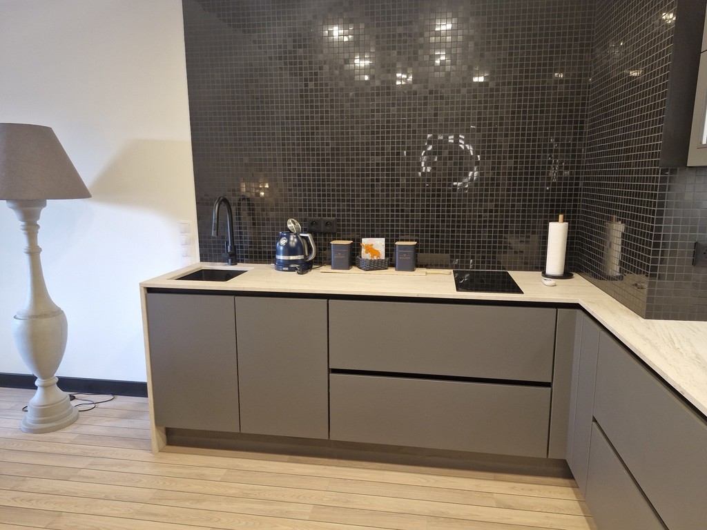 Kuchnia niemieckiej produkcji o wysmakowanych frontach w szarym macie cudownie komponuje z czernią kafelków. Kuchnia jest wyposażona we wszystkie potrzebne sprzęty: zmywarkę, lodówkę, piekarnik itd.