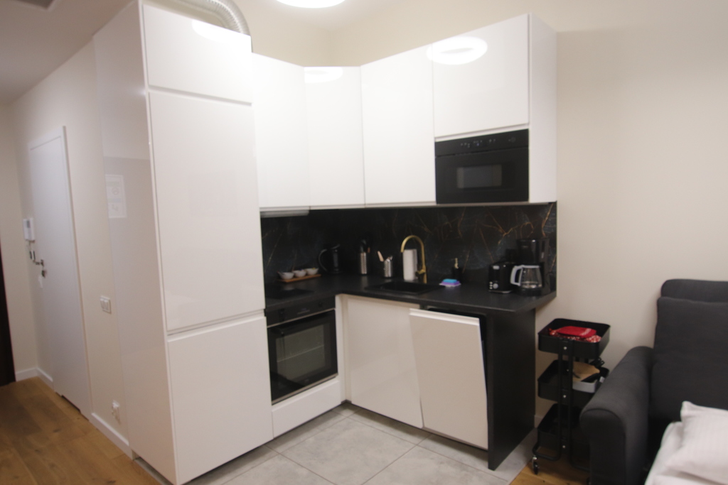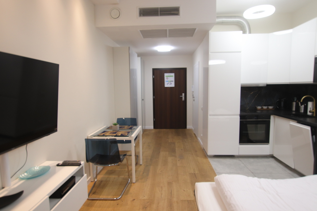 Mieszkanie wyposażone jest w sprzęt AGD (pralka, lodówka, zmywarka, okap, płyta indukcyjna, zlewozmywak). Sztućce, talerze, garnki znajduje się w apartamencie.