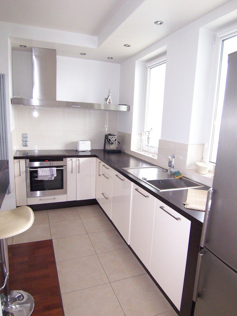 Kuchnia z nowoczesnymi meblami w zabudowie w pełni wyposażona: lodówka, płyta grzewcza, piekarnik, zmywarka.