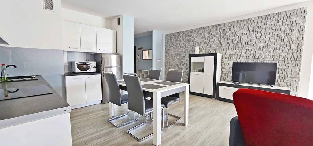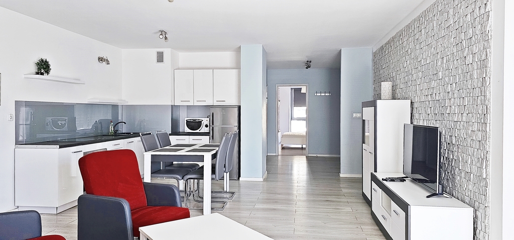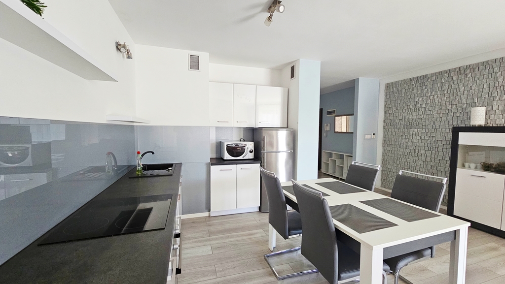 We wszystkich pomieszczeniach na ścianach gładź, a na podłogach dobrej klasy panele Aneks kuchenny wyposażony w meble wykonane na wymiar płytę kuchenną, piekarnik, zmywarkę, pochłaniacz zapachów, lodówkę. W przedpokoju duża szafa w zabudowie.