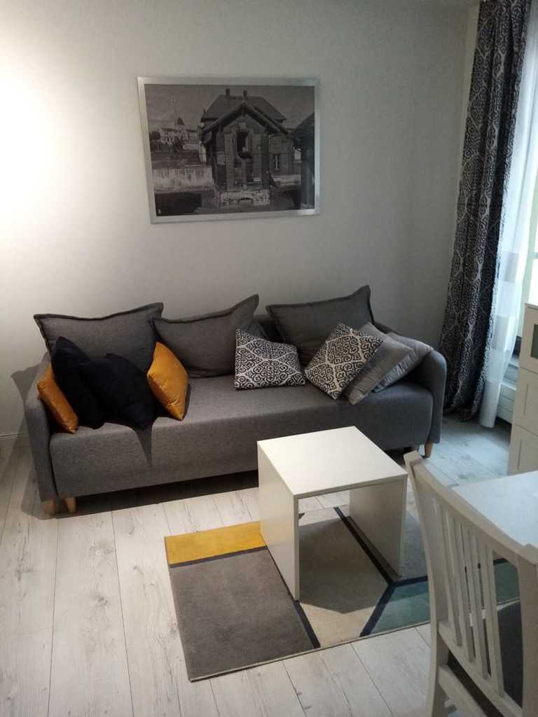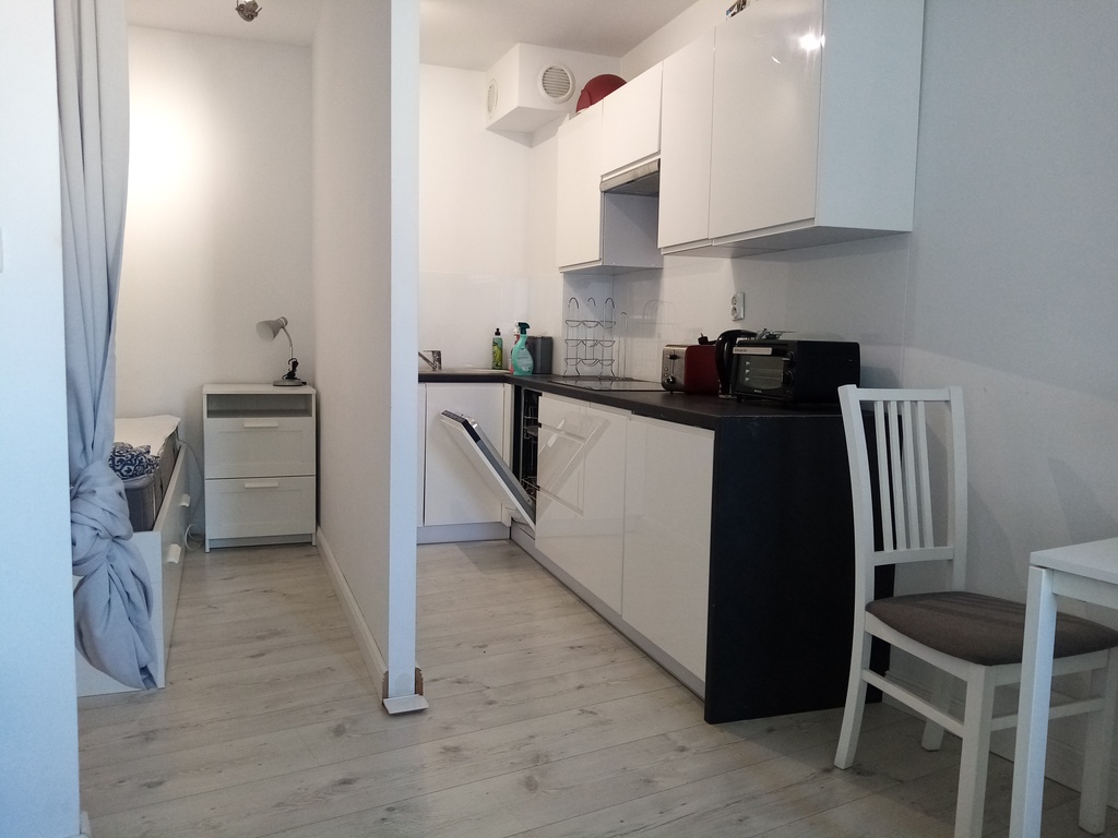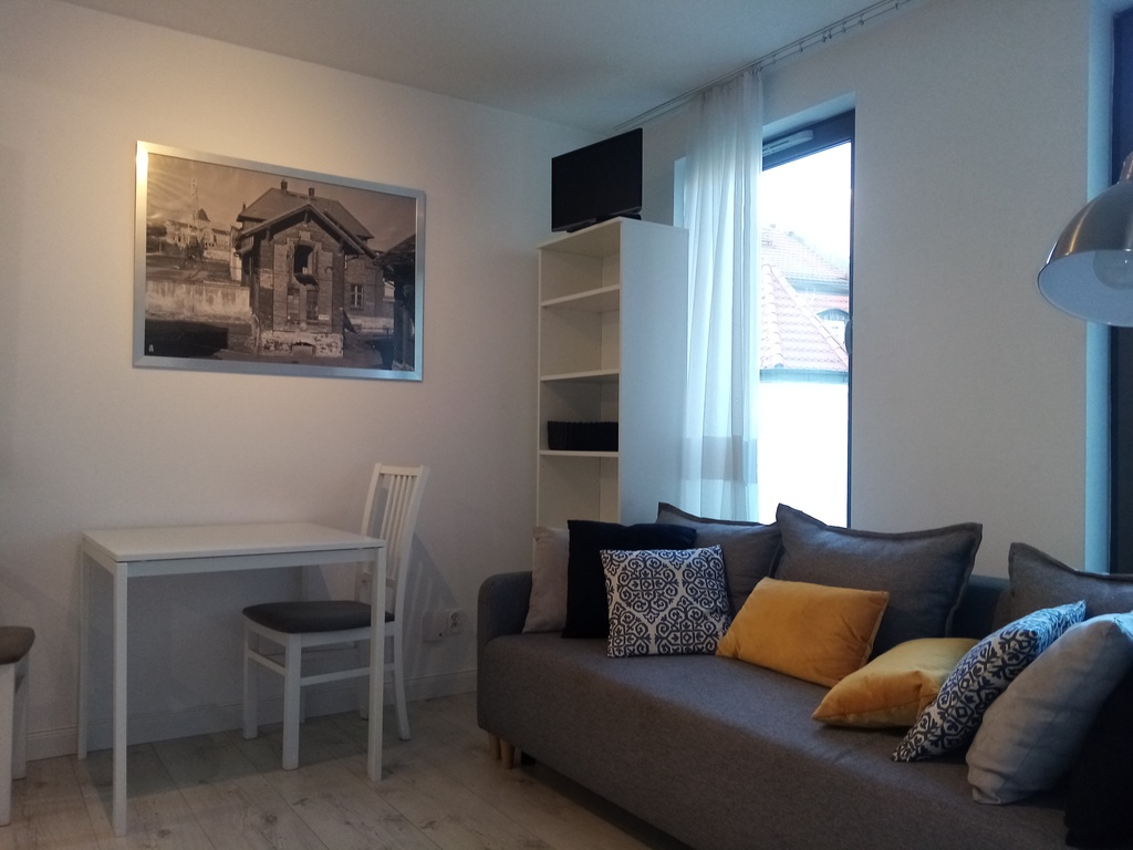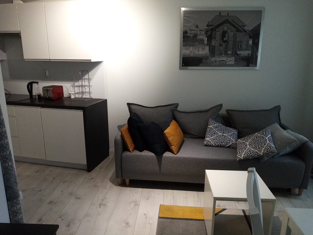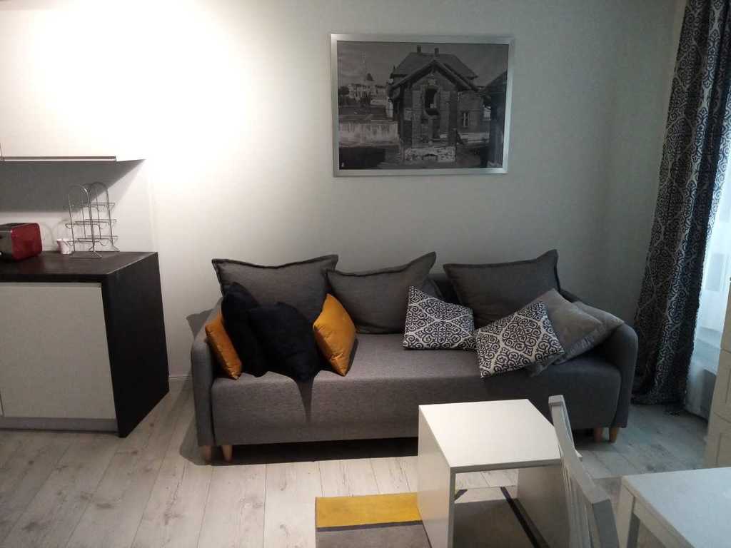 Mieszkanko posiada oddzielny aneks sypialny (łóżko 140x200), salonik (kanapa rozkładana), aneks kuchenny oraz łazienkę z prysznicem, przedpokój. Studio ma ok.29 m2, jest bardzo przytulne, komfortowe i w pełni wyposażone.