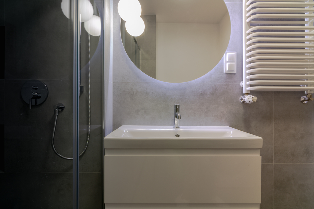 - łazienka z prysznicem i pralką