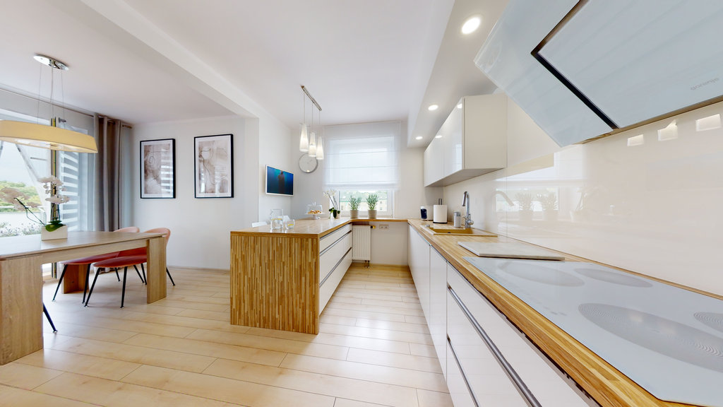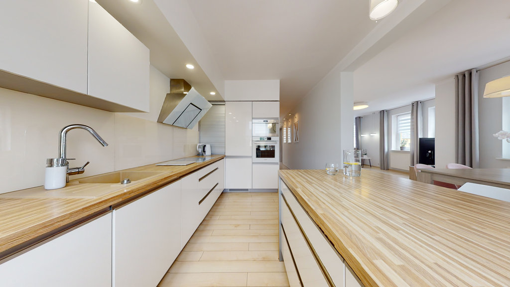 Na pierwszym poziomie znajduje się w pełni wyposażona kuchnia o nowoczesnym designie, która przechodzi w jasny i przytulny salon, stwarzający doskonałą atmosferę do wypoczynku i spotkań rodzinnych oraz jedna z dwóch eleganckich łazienek (idealna dla gości lub dzieci).