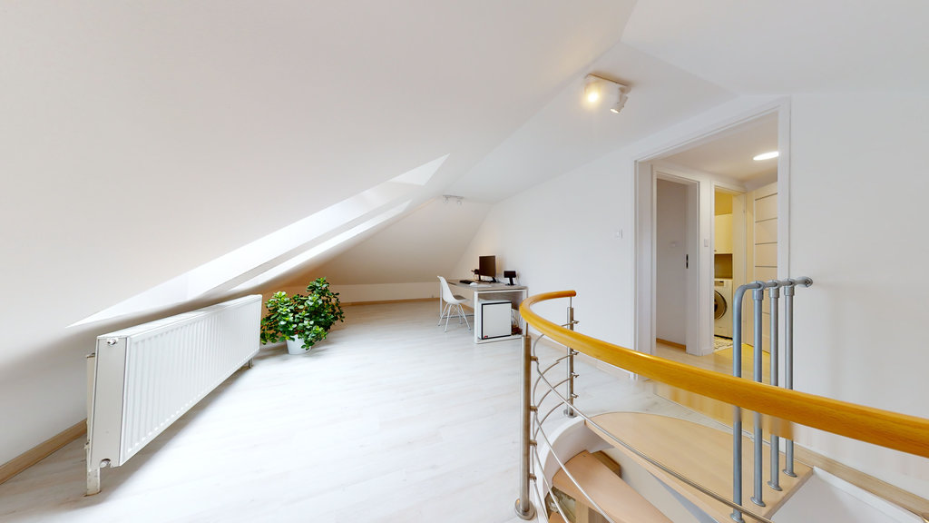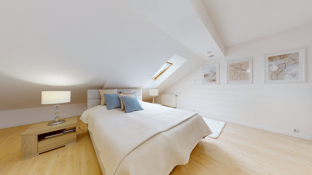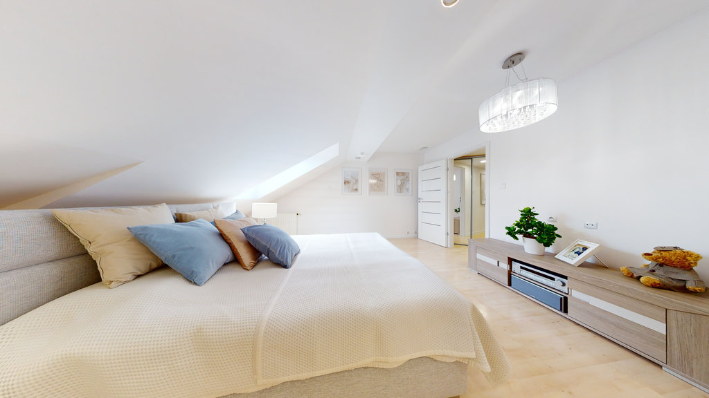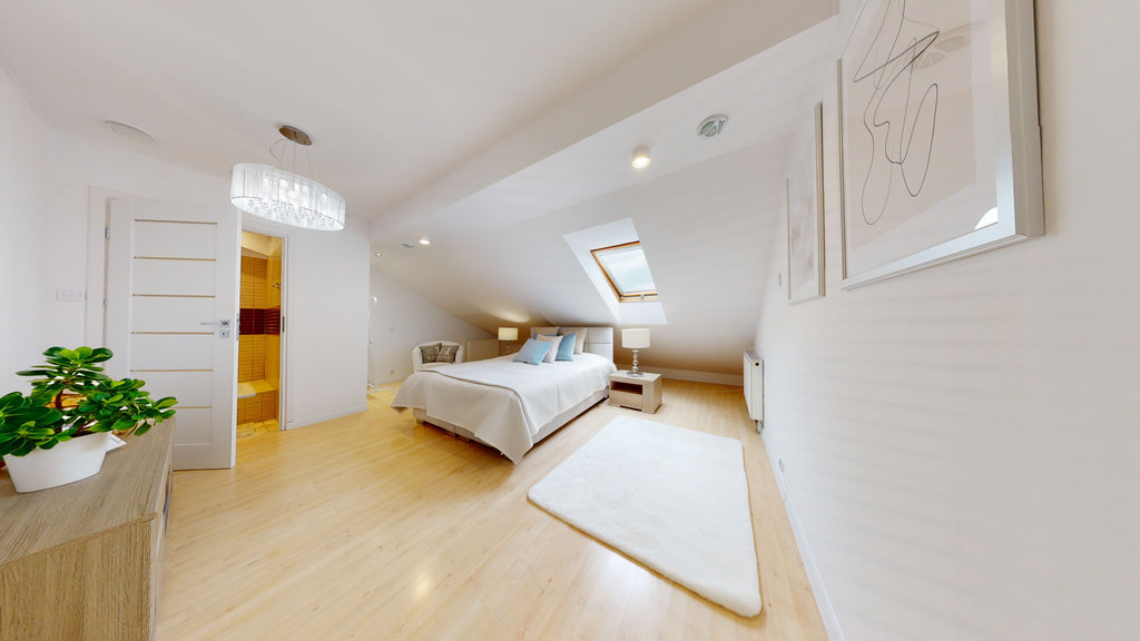 Jednak to nie wszystko! Wewnętrzne schody prowadzą na drugi poziom, gdzie znajdują się kolejne trzy przestronne pokoje, które można zaaranżować jako dodatkowe sypialnie, gabinety lub pomieszczenia rekreacyjne.