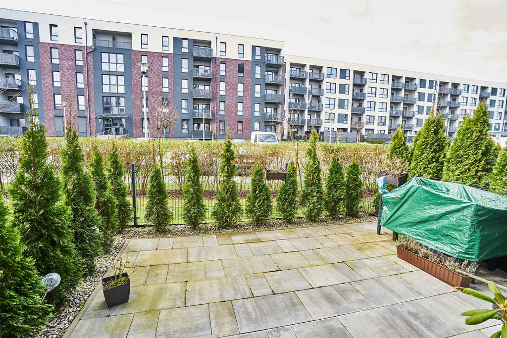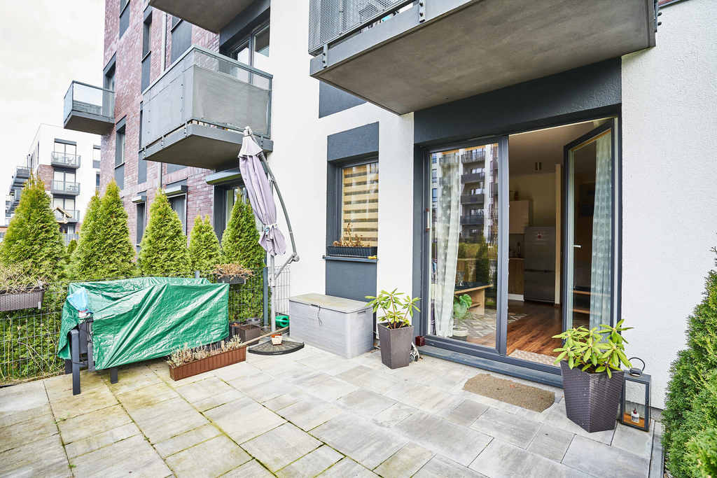 Powierzchnia mieszkania 26,64 m2 i dzieli się na pokój z aneksem kuchennymi wyjściem na taras/ogródek, łazienkę z WC oraz przedpokój. W pokojach na podłogach panele, ściany gładzone. Kuchnia zabudowana meblami, wyposażona w AGD (lodówka, zlewozmywak, płyta z piekarnikiem). Łazienka z prysznicem i WC wykończona glazurą i terakotą.