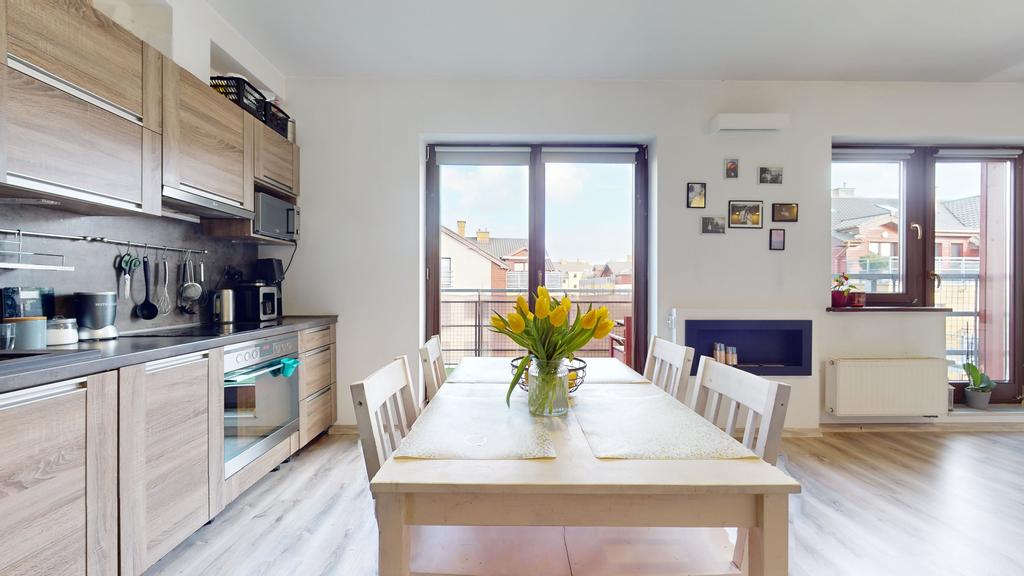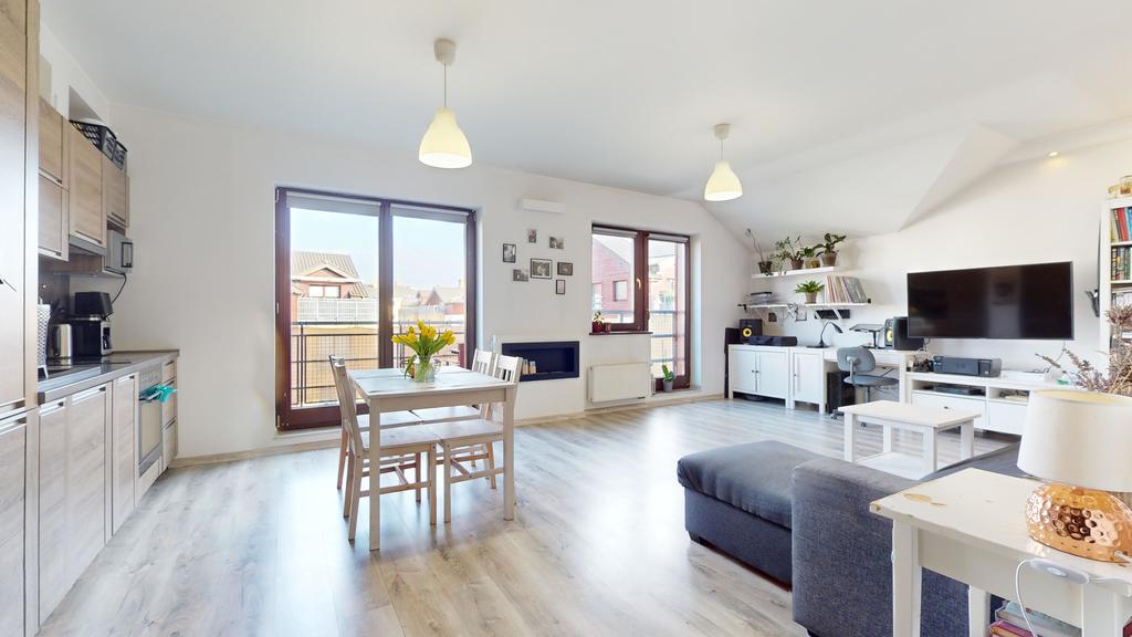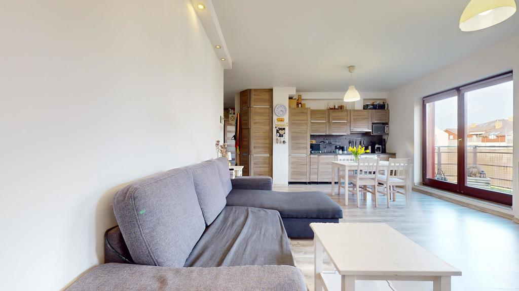 - przestronnego salonu z aneksem kuchennym, z którego jest wyjście na duży balkon,