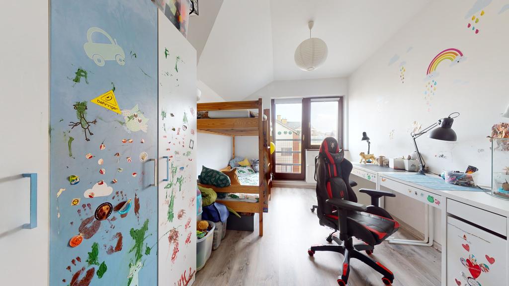 Na drugi poziomie znajduje się antresola, która została zaadaptowana na sypialnię. W najwyższym punkcie wysokość jest 1,80m . W pokoju tym znajdują się liczne, głębokie szafki i schowki.