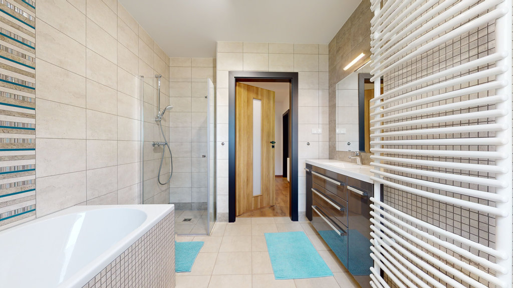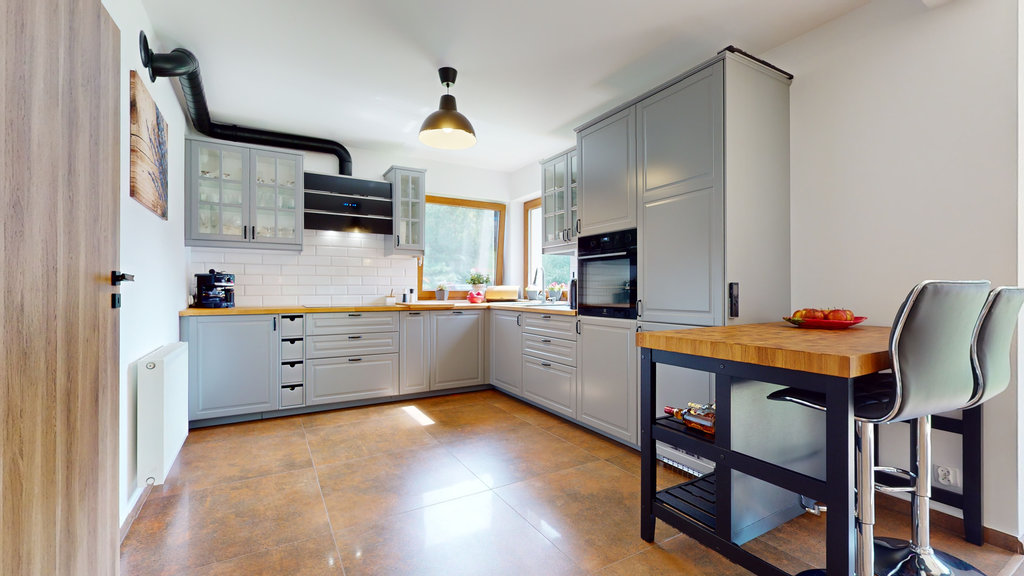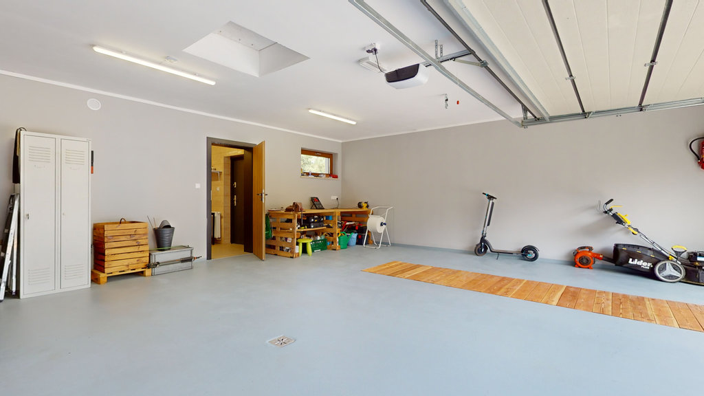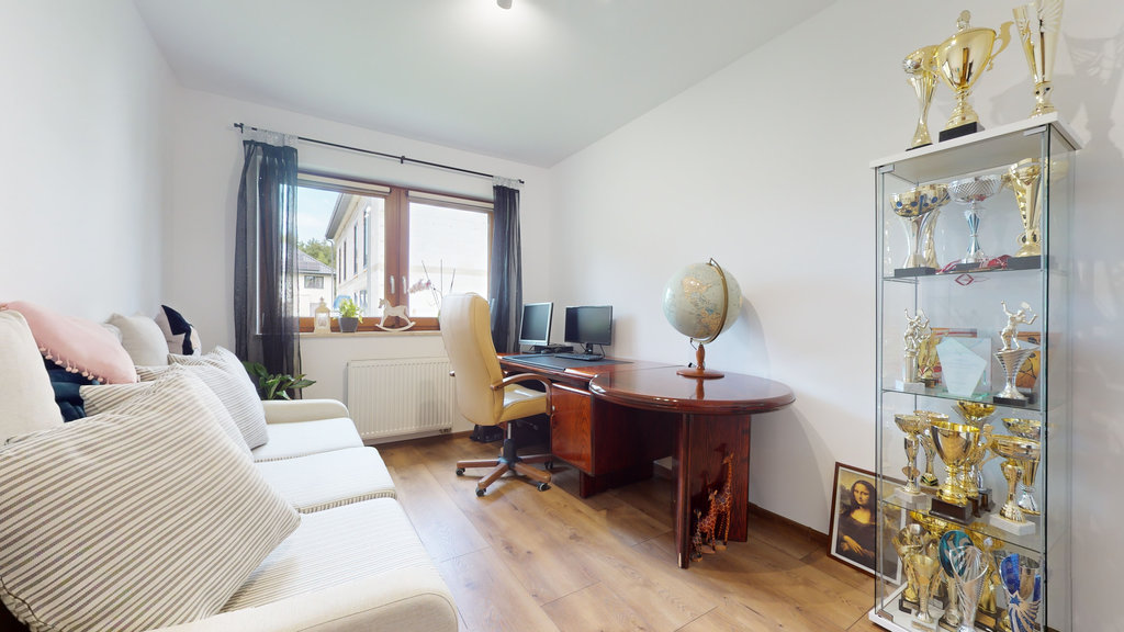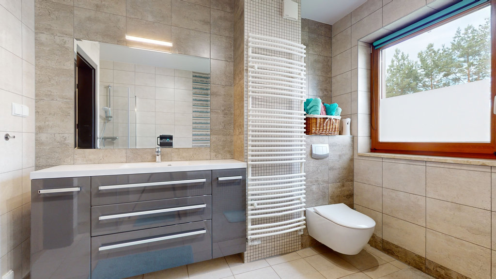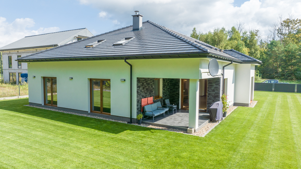 Elewacja domu została ocieplona styropianem grafitowym o grubości 20 cm, a trzyszybowe okna wyposażone w rolety zewnętrzne utrzymują ciepło wewnątrz domu nawet w mroźne dni. Nowoczesna dachówka ceramiczna plaska Brass zapewnia długotrwałą ochronę przed warunkami atmosferycznymi, a monitoring zapewnia poczucie bezpieczeństwa. Dom ogrzewany jest za pomocą kotła gazowego.