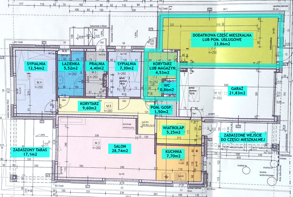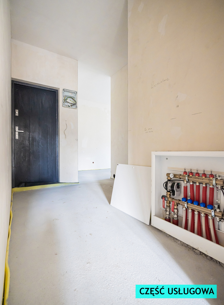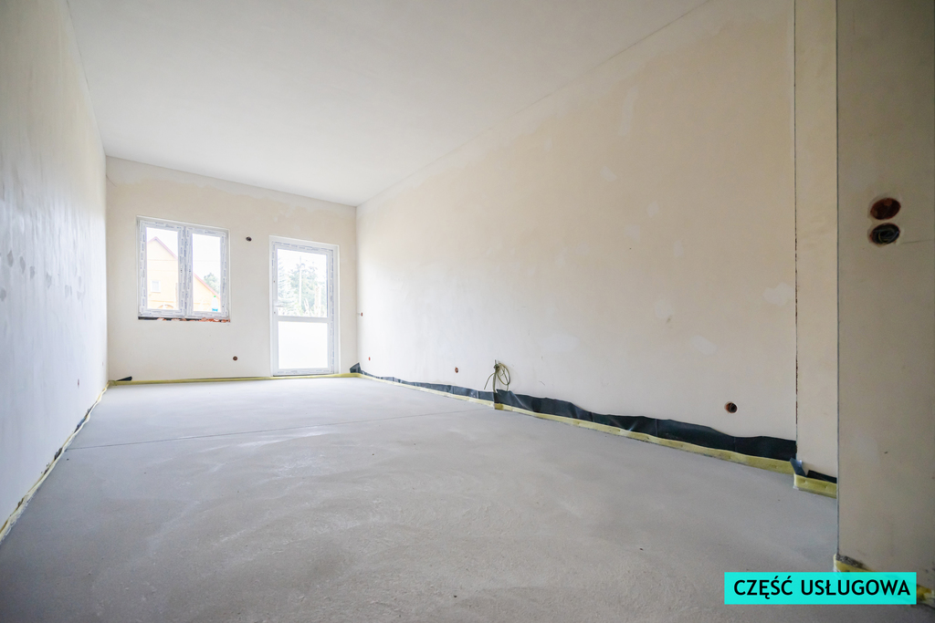 Dodatkowo - w bryle budynku znajduje się wydzielona część handlowo-usługowa składająca się z magazynu (4,53m2) i WC (0,86m2) oraz pomieszczenia usługowego (23,86m2), z 2 osobnymi wyjściami na zewnątrz i osobnymi licznikami na wodę, prąd, instalacją alarmową i możliwością podłączenia kamer. Przestrzeń można wykorzystać zarówno pod usługi (sklep spożywczy, salon kosmetyczny, gabinet), jak i dodatkowe pokoje lub kawalerkę na wynajem/na własne potrzeby.