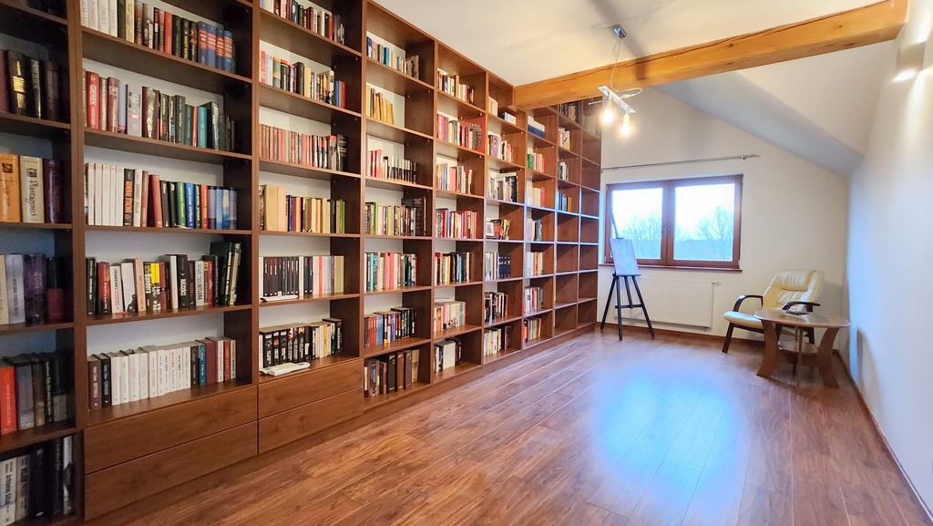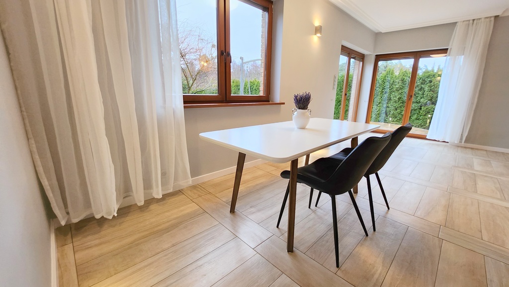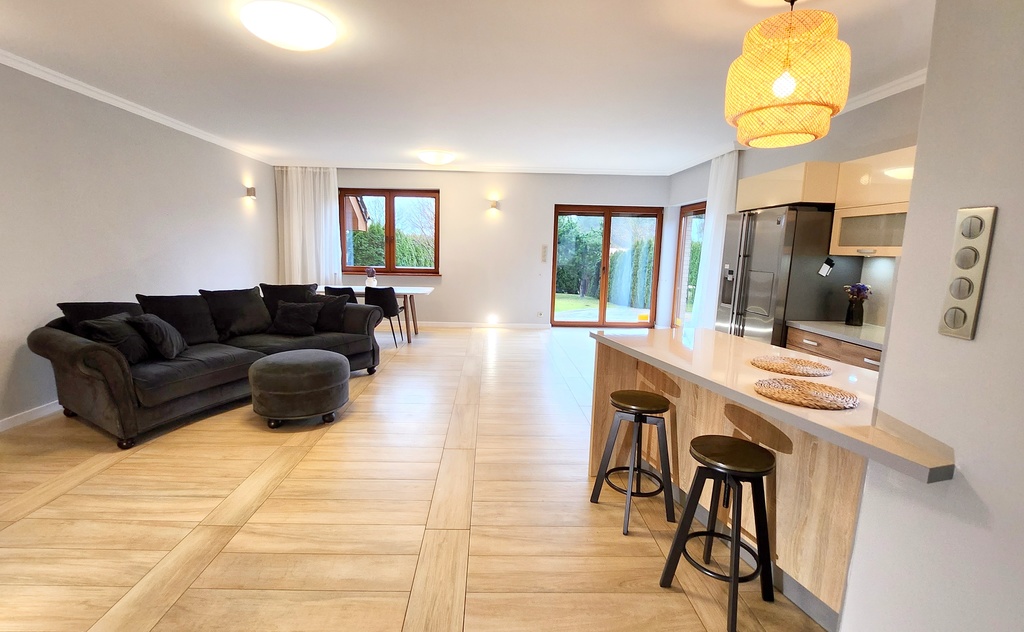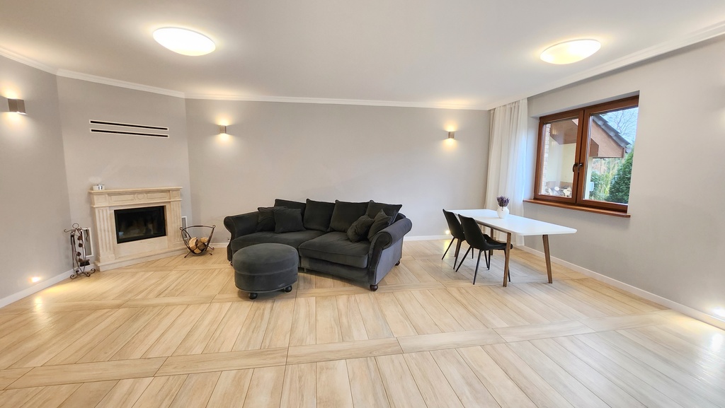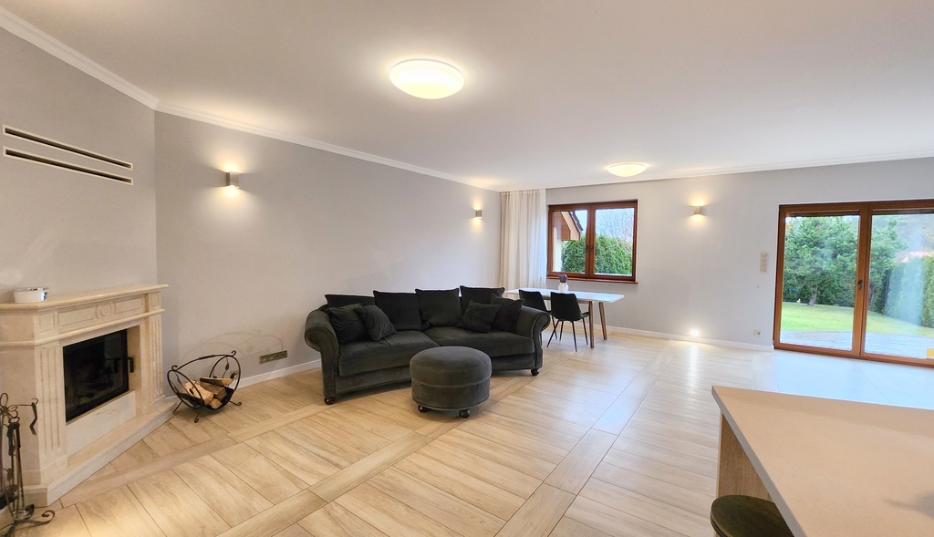 - duży salon z jadalnią; w salonie kominek; na podłodze terakota; z salonu wyjście na taras i do ogrodu, który ma automatyczne podlewanie