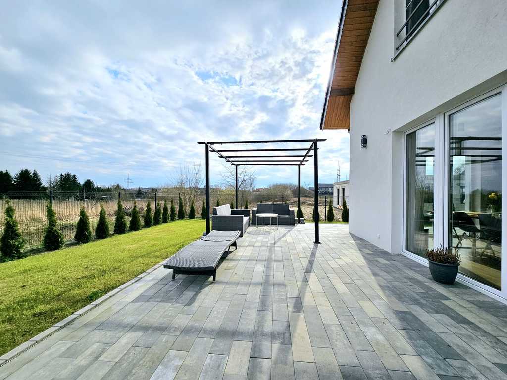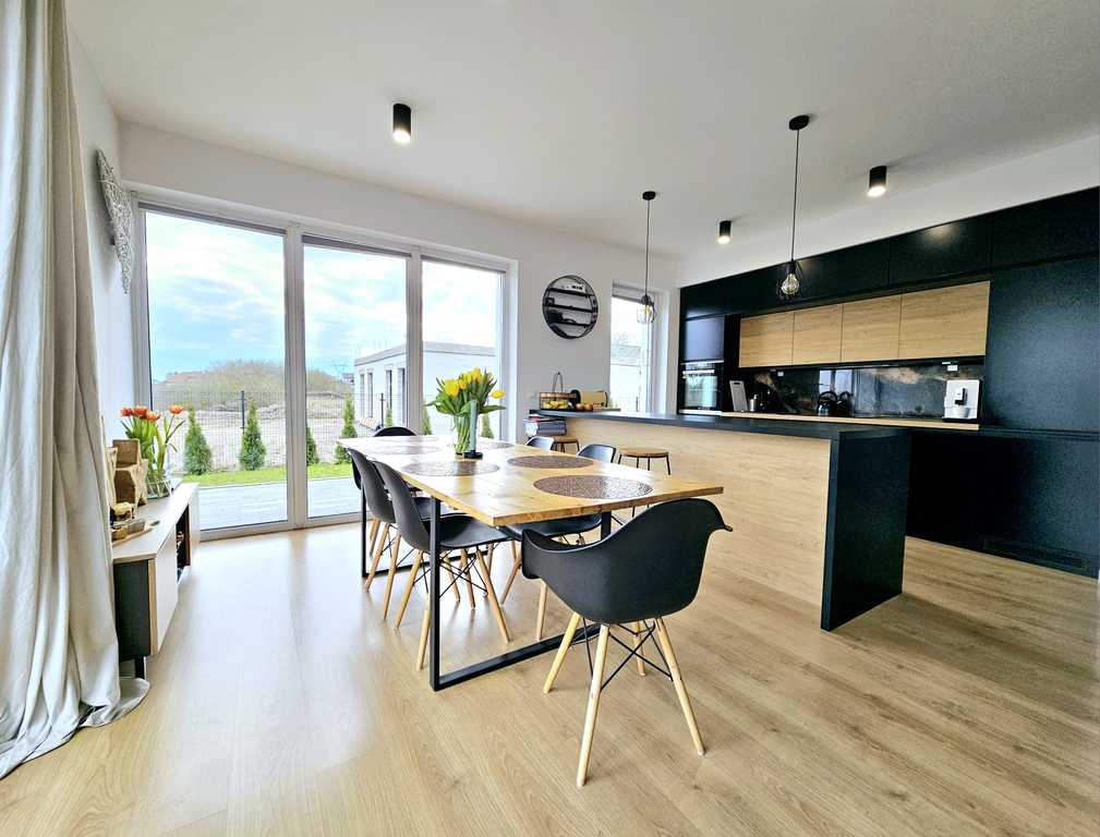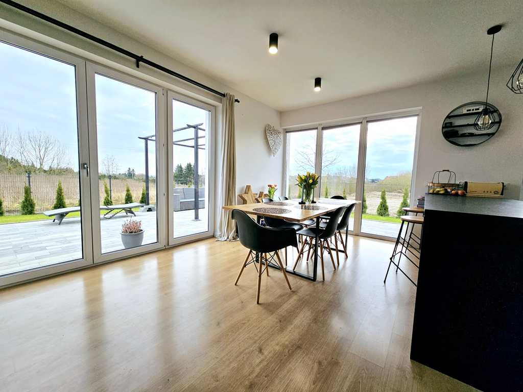 Oferujemy do sprzedania atrakcyjny i nowoczesny dom, wybudowany w 2021 roku, umiejscowiony się w świetnej lokalizacji Mierzyna. Budynek dwukondygnacyjny o powierzchni całkowitej 180 m2 i działce 600 m2. Pierwszy poziom domu, będący strefę dzienną, stanowi otwarta kuchnia z jadalnią oraz przestronny salon z wyjściem na duży 60 metrowy taras. Ponadto, na parterze budynku znajduje się dodatkowo spiżarnia, przestronna łazienka z prysznicem oraz duży przedpokój. Natomiast na piętrze domu, mieści się strefa nocna, z 4 przestronnymi sypialniami, garderobą oraz dużą, główną łazienką. Dom ma także obszerny strych o wysokości 1.8 m i powierzchni około 45 m2. W bryle budynku znajduje się także garaż dwustanowiskowy oraz kotłownia. Budynek w całości zasilany prądem oraz ogrzewany pompą ciepła Atlantic 10kw. Atutem, układ paneli fotowoltaicznych o mocy 10kw (na starych zasadach - jeszcze 13 lat). Zbiornik na szambo o powierzchni 10 m3 wystarczający przynajmniej na miesiąc użytkowania wody. Dom jest bardzo ciepły i energooszczędny. Miesięczny koszt za energię i ogrzewanie, oscyluje w okolicach niecałych 400 zł, dodatkowo wywóz szamba - około 240 zł. Budynek jest świetnie zlokalizowany i skomunikowany, w pobliżu sklepy Biedronka i Netto, przystanek autobusowy, a do CH Ster, niespełna 5 minut drogi pojazdem. Atutem domu, potencjał na montaż kominka w salonie oraz instalację kamer zewnętrznych. Świetnym rozwiązaniem jest także duży zbiornik na deszczówkę.