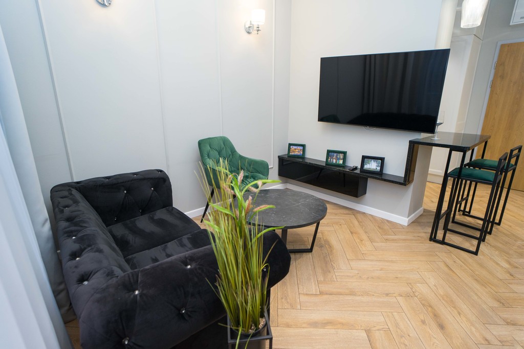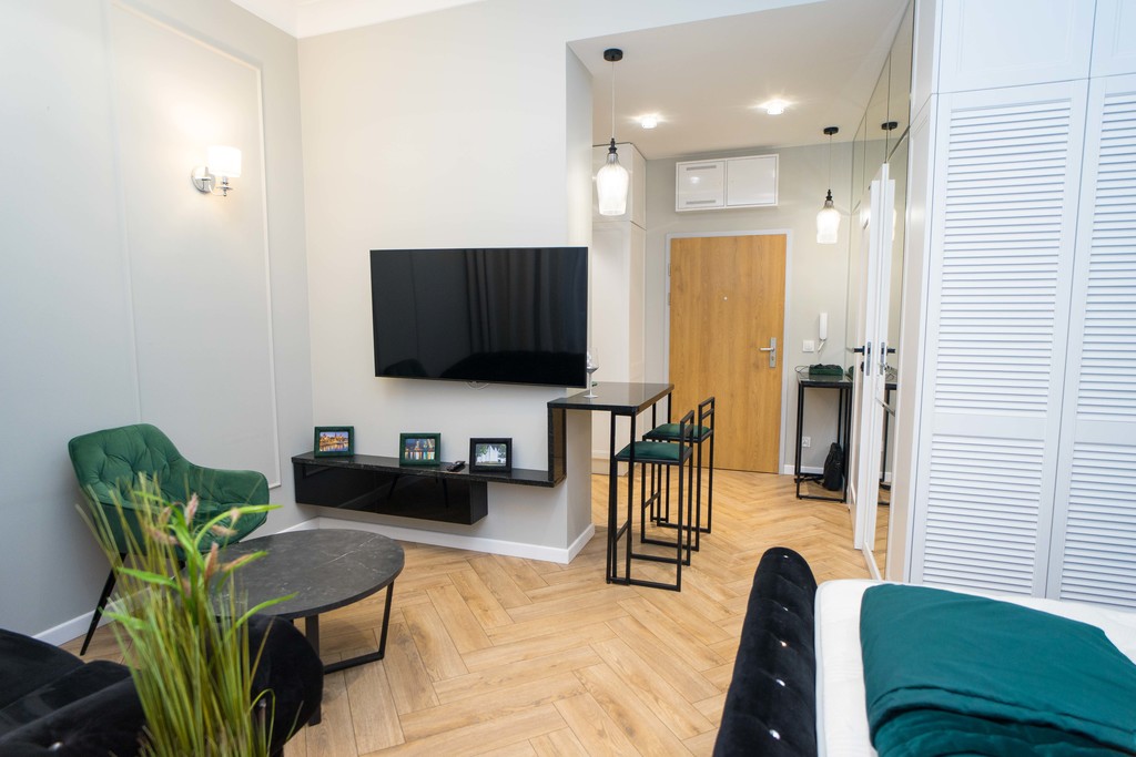 Na malowanej i gładzonej ścianie podwieszony telewizor, na podłodze parkiet, wnętrze stylizowane na kamienicę z początku XX wieku.