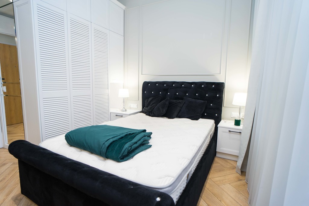 W salonie znajduje się wydzielona część na wypoczynek a w niej wygodne podwójne łóżko, 2 nocne szafki, duża szafa, fotel, sofka, okrągły stolik.