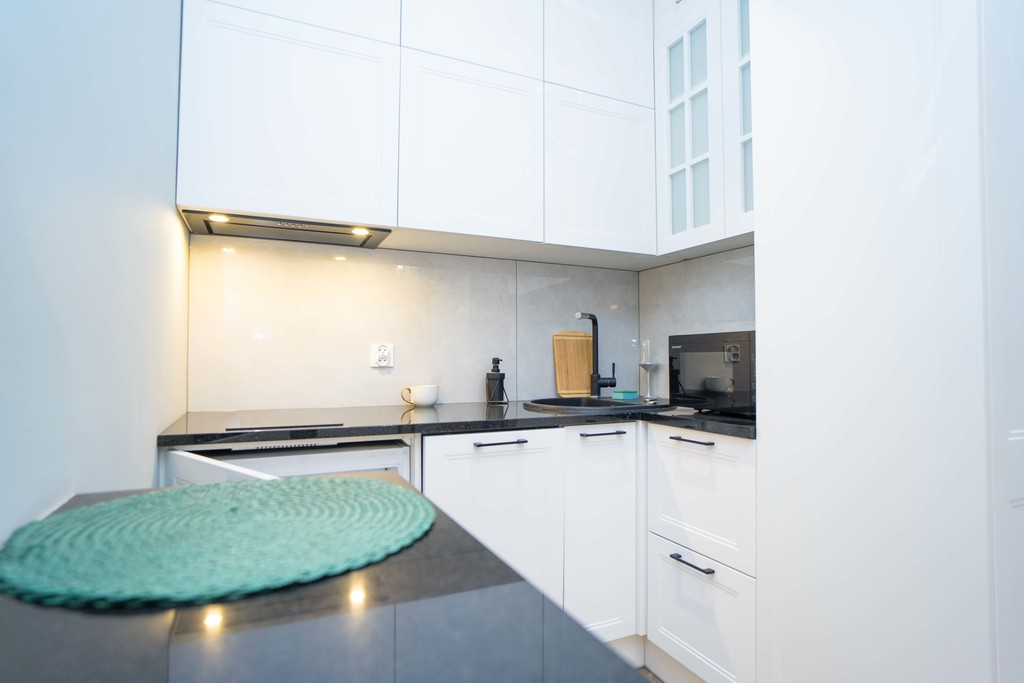Część wspólna wydzielona na dwie funkcję: przedpokój z lustrem i półką, oraz kuchnię z kątem pełniącym rolę jadalni w której są dwa metalowe krzesła i blat wkomponowany w ścianę. Część kuchenna posiada meble w zabudowie, oraz na wyposażeniu: lodówkę, zlew, indukcyjną płytę grzewczą, zmywarkę, okap, mikrofalówkę. Mieszkanie jest bardzo funkcjonalne i ciepłe, budynek jest docieplony.