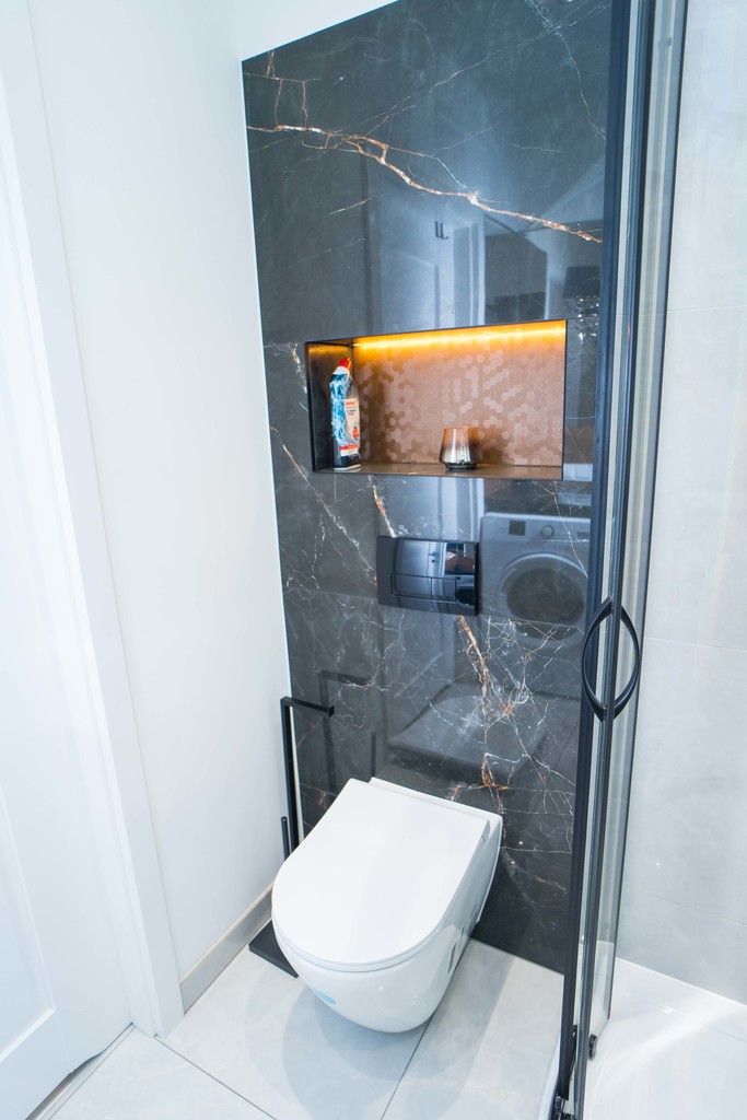 Łazienka razem z toaletą, posiada na ścianach glazurę a na podłodze terakotę. Na jej wyposażeniu znajduje się kabina prysznicowa, szafki w zabudowie, umywalka, pralka, grzejnik drabinkowy, eleganckie kinkiety.