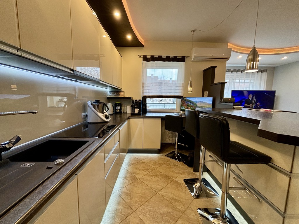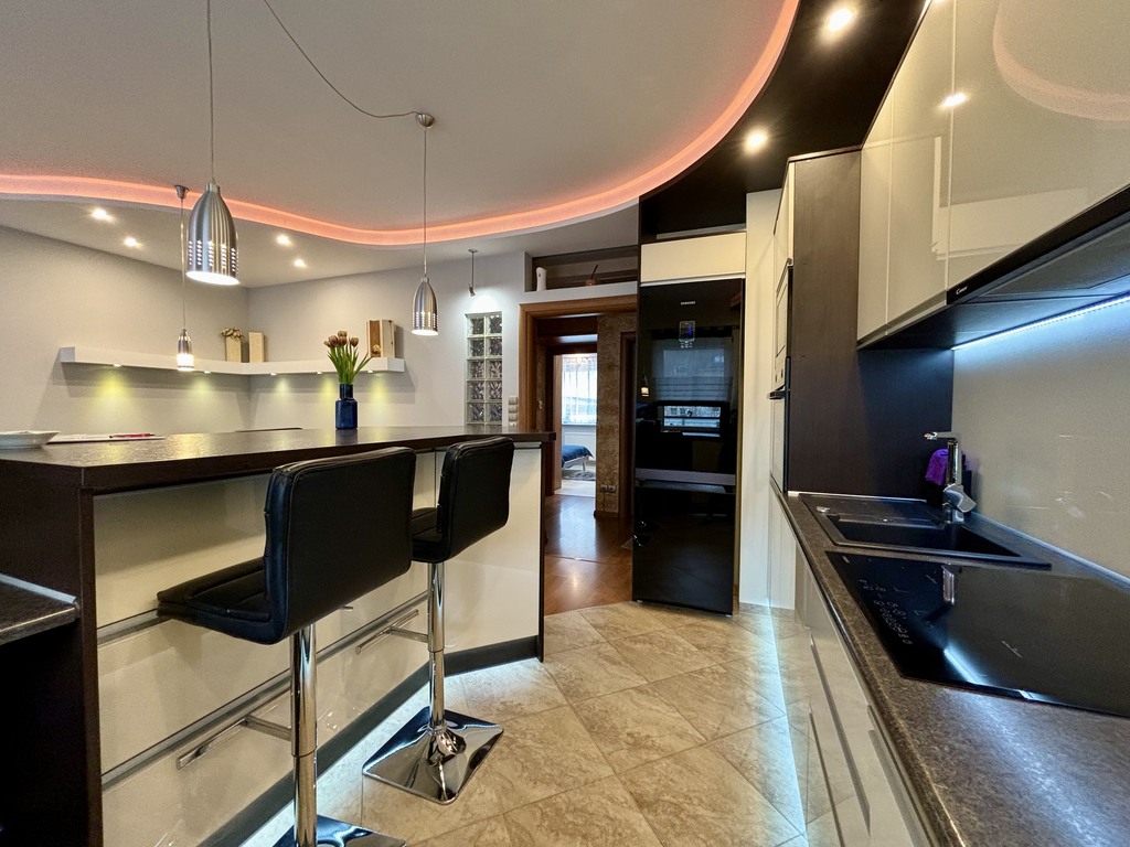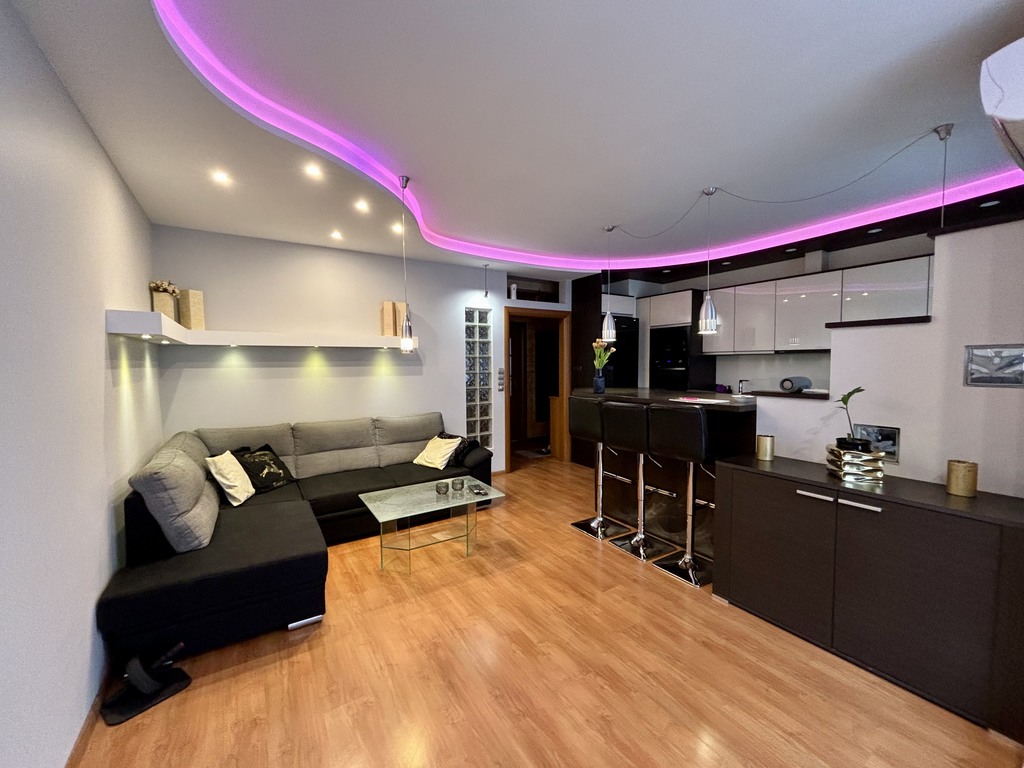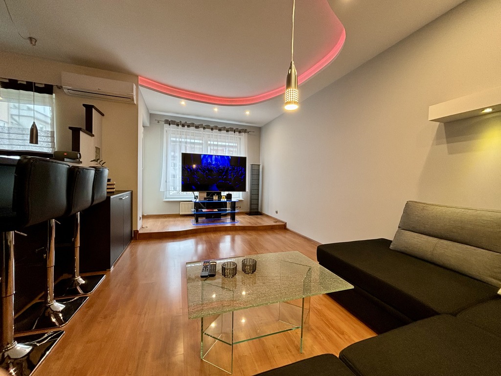 Salon bardzo ustawny, a z niego wyjście na spory balkon (4m2). Łazienka zadowoli każdego przyszłego mieszkańca ponieważ prócz nietuzinkowego designu posiada dużą wannę jak i prysznic. W oby dwóch sypialniach ściany są gładzone i pomalowane w jasnych kolorach. Na podłogach panele. W kuchni zdecydowanie przykuwa uwagę wyspa z hokerami. Meble są białe a wszystkie elementy i detale ciemne. Przestronny korytarz z luksferami, które idealnie komponują się z ciekawym oświetleniem na suficie.