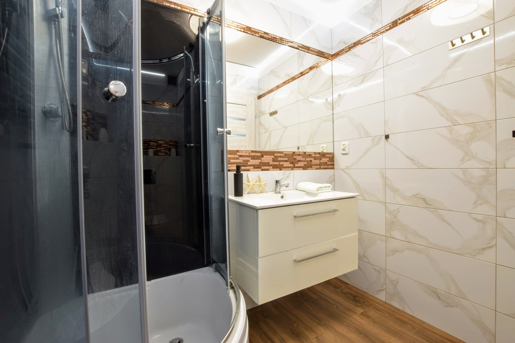 Wymienione zostały elektryka oraz piony wodno-kanalizacyjne. Okna PCV. Ściany gładzone, malowane. Sufity podwieszane, zamontowane zostało dodatkowo oświetlenie LED.