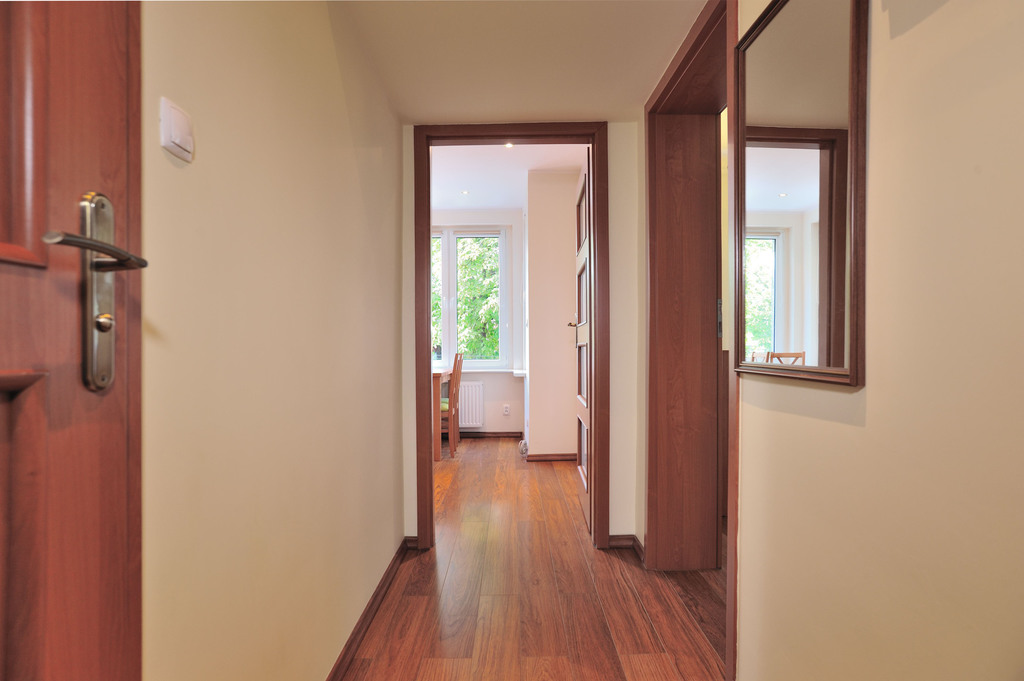 OPIS MIESZKANIA: Do wynajęcia mieszkanie znajdujące się na drugim piętrze 3-piętrowej kamienicy. Jego całkowita powierzchnia wynosi 33,76 m2, jest w pełni umeblowane i wyposażone. W mieszkaniu znajduje się salon, oddzielna kuchnia z jadalnią, łazienka z wc oraz przedpokój. Wejście do mieszkania przez przedpokój z wieszakiem na ubrania, trzypoziomowym regałem na obuwie i lustrem. Łazienka wyposażona jest w kabinę prysznicową, WC, umywalkę i lustro, regał na kosmetyki, grzejnik drabinkowy. Kuchnia z jadalnią stanowi oddzielne pomieszczenie. Jest umeblowana i wyposażona w sprzęt AGD - płytę kuchenną gazową, piekarnik elektryczny, pralkę, mikrofalówkę, zmywarkę, lodówkę z zamrażalnikiem, pochłaniacz. W części jadalnianej znajduje się stół z czterema krzesłami. W pokoju jest rozkładana kanapa, szafa przesuwna z regałem, stolik, komoda, biurko i krzesło obrotowe.