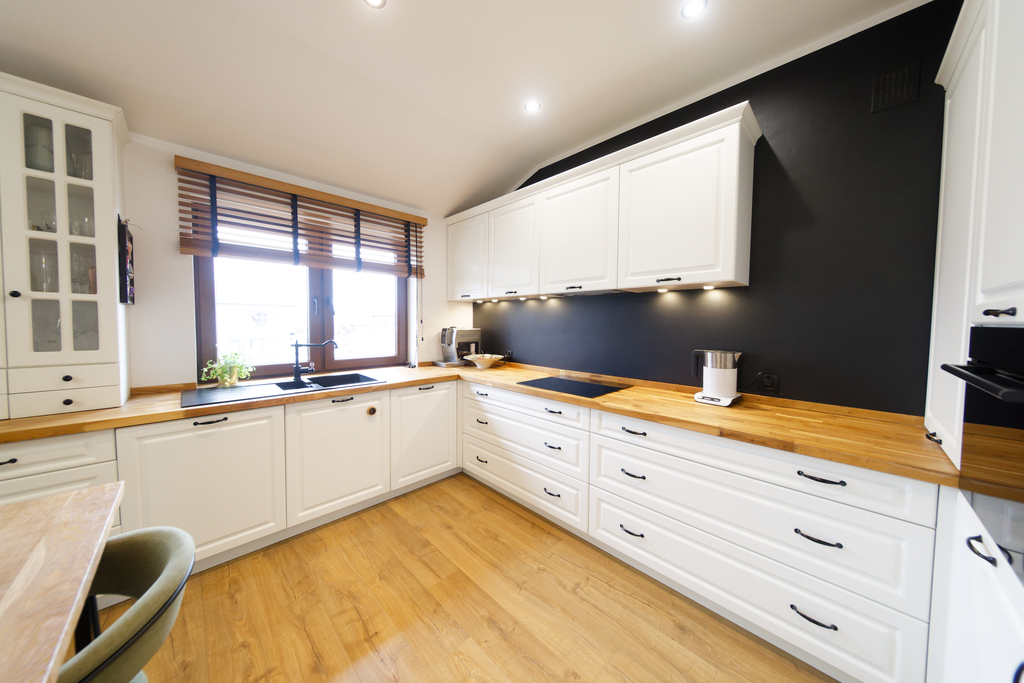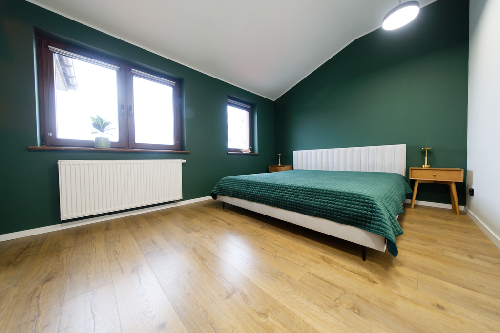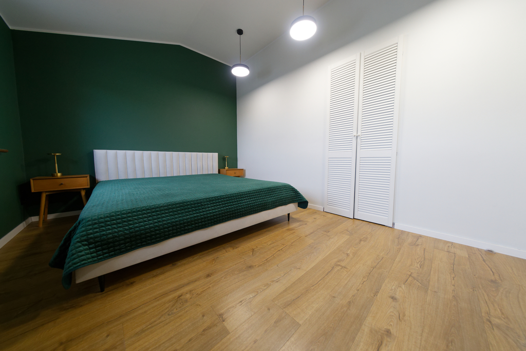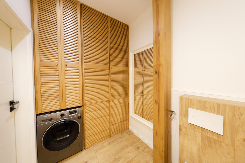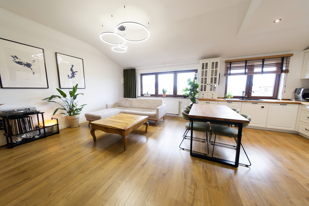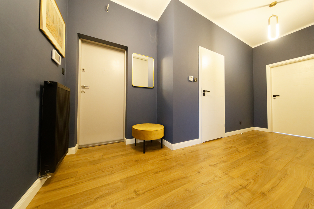 Wnętrze składa się z dużego salonu połączonego z otwartą kuchnią i jadalnią, o wysokości pomieszczenia 2,9 metra. Oprócz tego mieszkanie oferuje dwie sypialnie oraz dużą garderobę z dostępem zarówno z salonu, jak i z głównej sypialni. Łazienka jest przestronna, wyposażona w wannę i dużą szafę w zabudowie. W korytarzu znajduje się kolejna szafa.