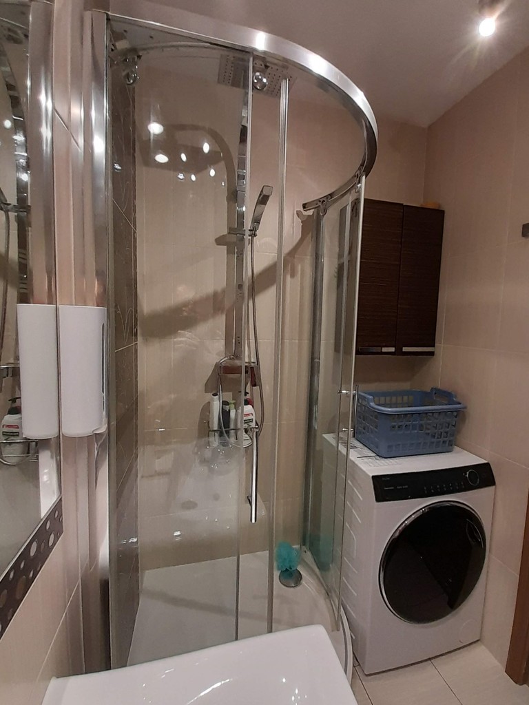 W chwili obecnej funkcjonuje jako mieszkanie 3 pokojowe i kuchnia połączona z jadalnią, ale istnieje możliwość łatwego przywrócenia układu 4-pokojowego poprzez przywrócenie ścianki działowej pomiędzy kuchnią i jadalnią, w łazience pralka, kabina prysznicowa, umywalka. WC oddzielnie z umywalką.