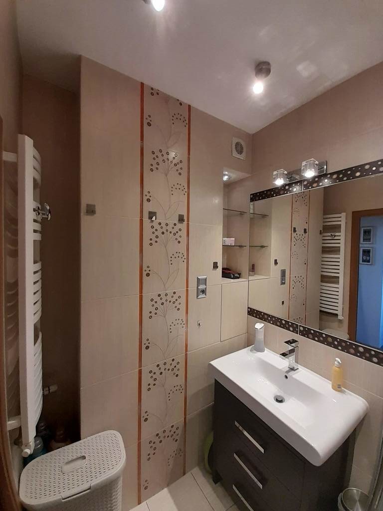 Na ścianach gładź, na podłogach gres/panele, instalacja elektryczna miedziana, wymienione piony wodne, zdalnie odczytywane wodomierze i podzielniki ciepła. Mieszkanie częściowo umeblowane, w stanie do zamieszkania, ewentualnie do lekkiego odświeżenia.