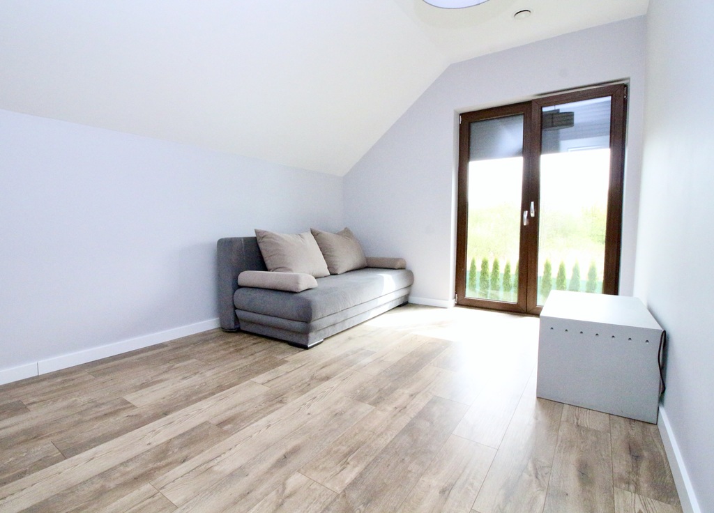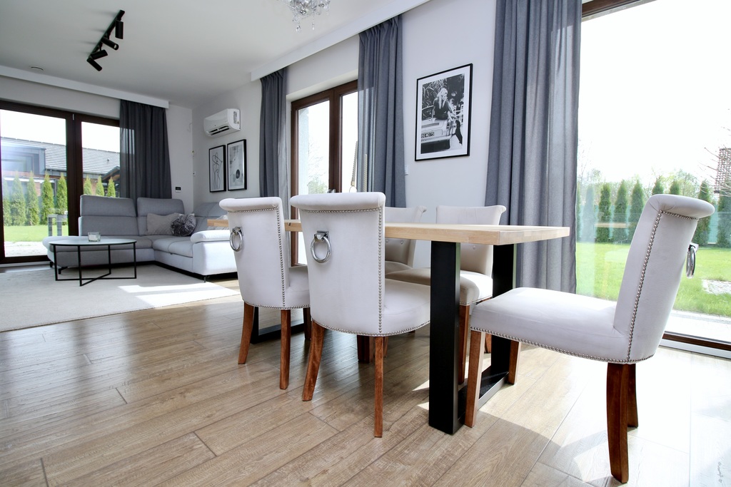 - słoneczny salon z aneksem jadalnianym oraz wyjściem na taras