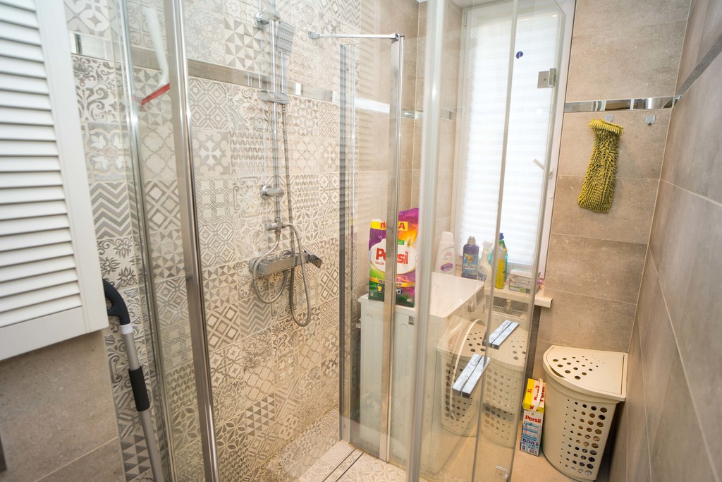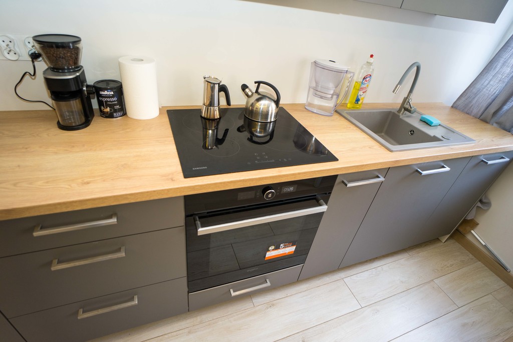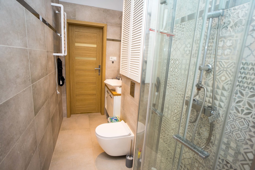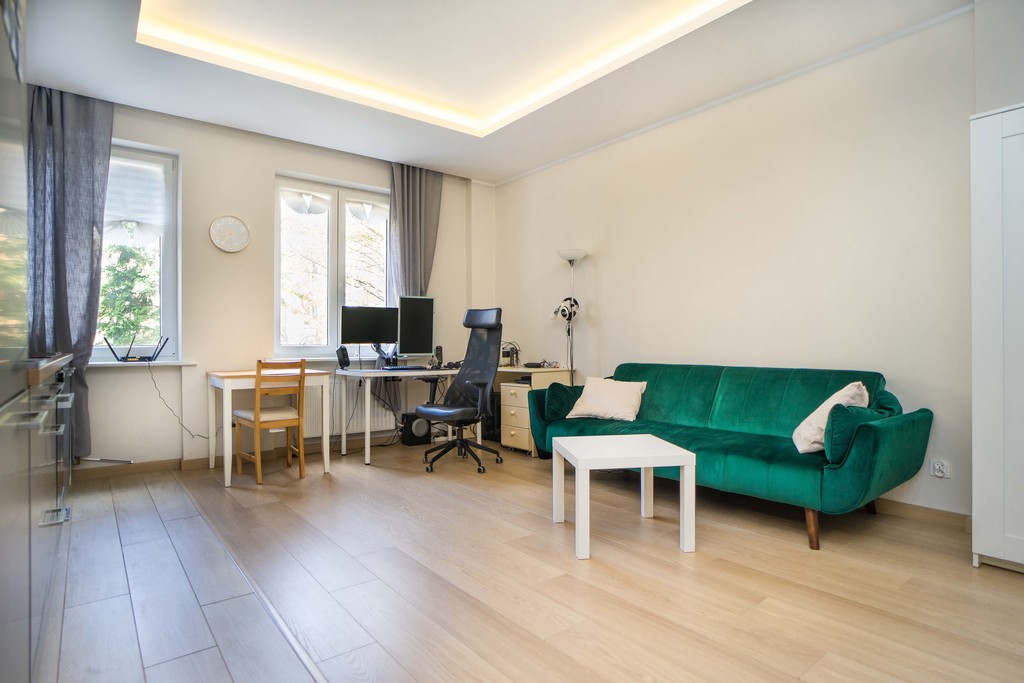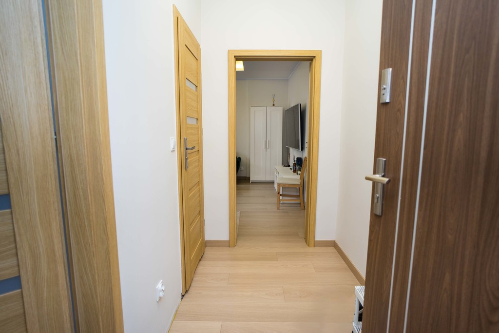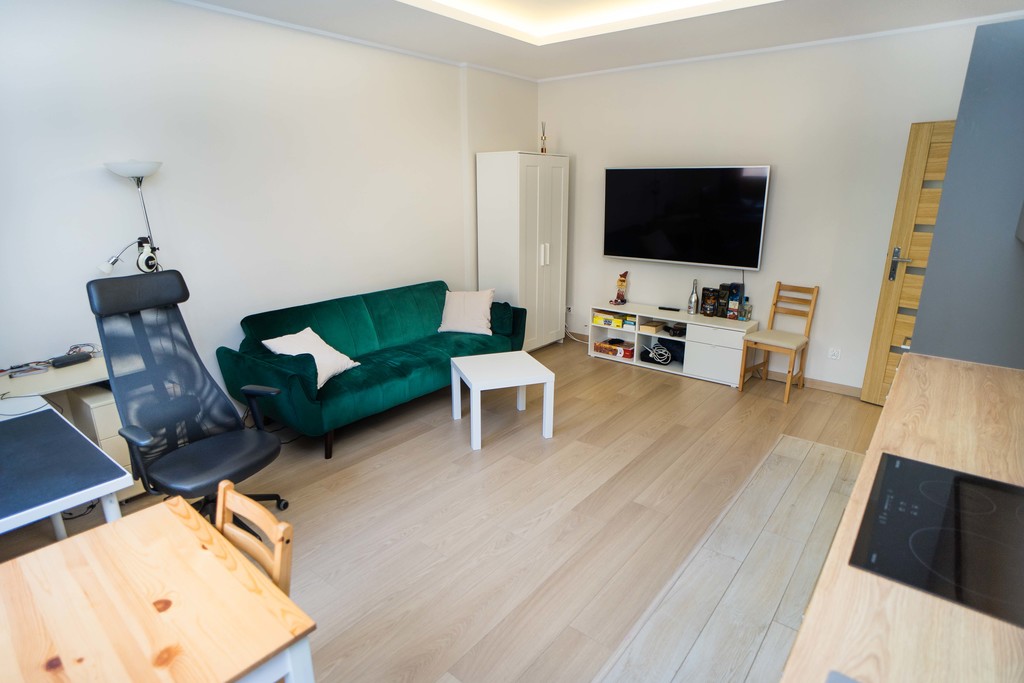 Lokal jest po kapitalnym remoncie - wysoko budżetowym. Wszystkie instalacje zostały wymienione, zamontowano podwieszane sufity, ściany gładzone malowane, a na podłogach są odporne na ścieranie i wilgoć wysokoganunkowe panele VOX. W łazience glazura i terakota, na ścianie zamontowana składana kabina prysznicowa Radway (po złożeniu zaledwie 30 cm od ściany). W salonie z aneksem kuchennym, na wyposażeniu: lodówka, piekarnik, płyta indukcyjna , zmywarka , przestronne szafki z ledowym podświetleniem, a w łazience pralkosuszarka.