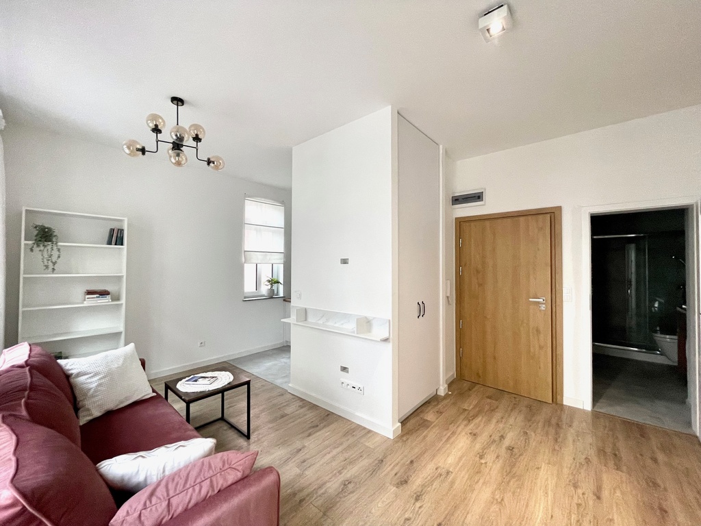 Na powierzchni 25,43 m2 do dyspozycji najemcy jest pokój z aneksem kuchennym oraz łazienka z wc i kabiną prysznicową.