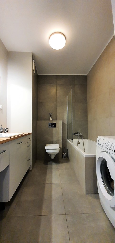 Łazienka z toaletą, wanna z parawanem, umywalka z zabudową szafkami, pralka.