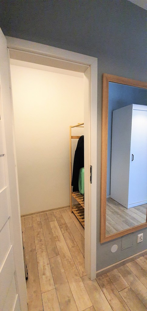 Przestronny przedpokój z szafą oraz garderobą w której są dwa wieszaki na ubrania.