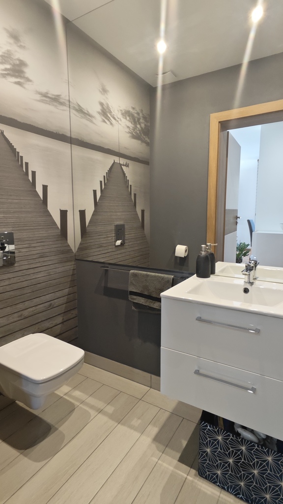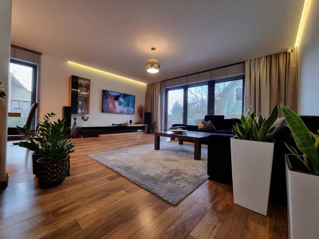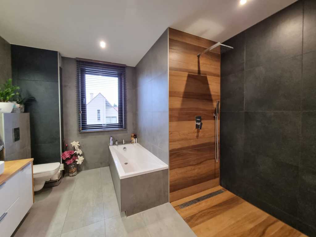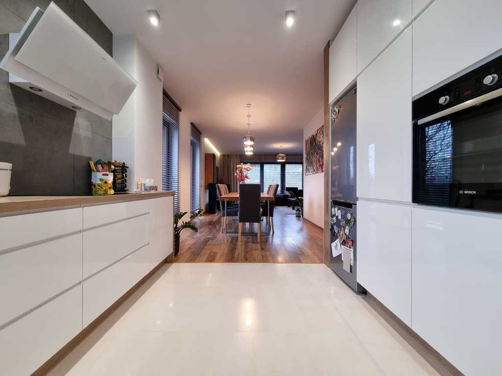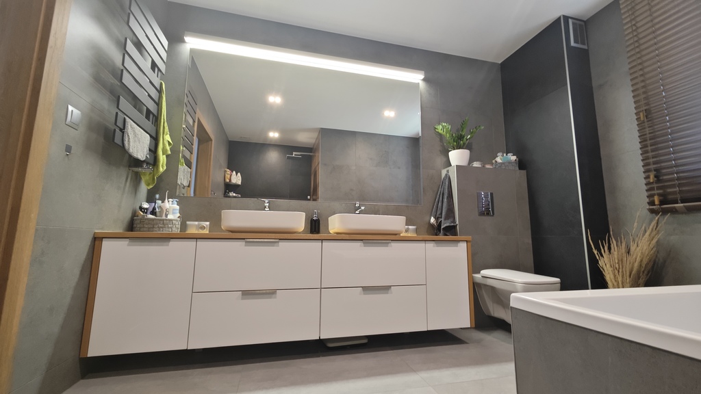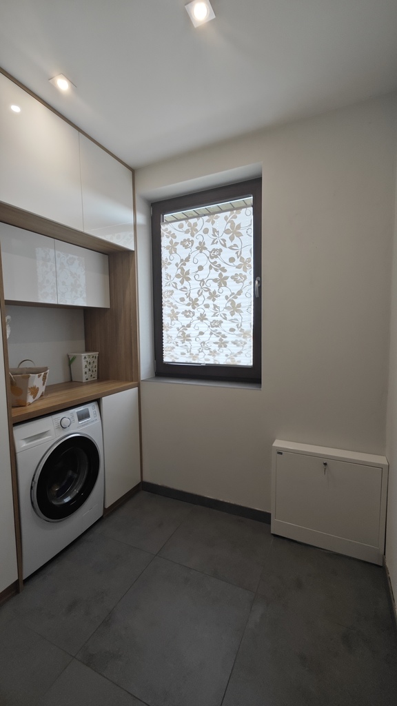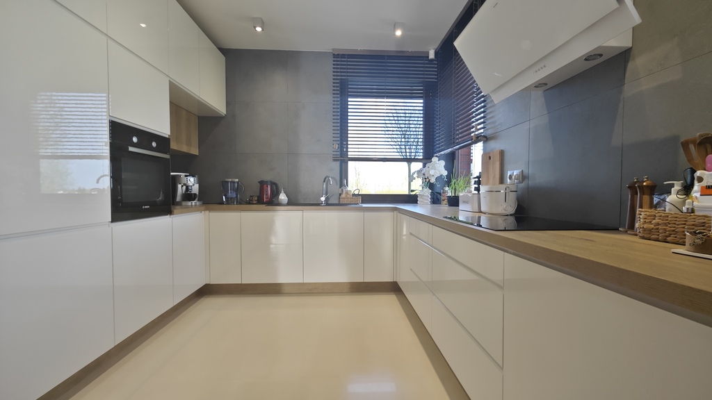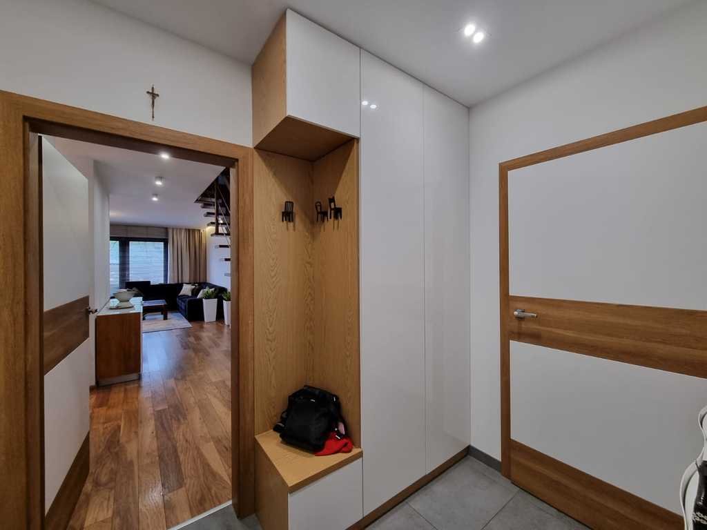 We wszystkich pokojach na podłodze panele (Krono Original). Tynki wewnętrzne cementowo-wapienne. W kuchni jasny gres na podłodze oraz szary gres na ścianach. Meble kuchenne na wymiar (lakierowane fronty) plus sprzęt AGD (lodówka Samsung, piekarnik i zmywarka firmy Bosch, płyta grzewcza Electrolux oraz okap Faber). Łazienka u góry w nowoczesnym szarym gresie plus kabina prysznicowa typu "walk in" z deszczownicą, wanna obudowana gresem, podwieszana muszla, grzejnik drabinkowy, dwie umywalki nablatowe, a pod nimi nowoczesne szafki i szuflady. W dolnej toalecie również podwieszana muszla plus umywalka z szafką (z szufladami). W pralni na piętrze poza pralką jedna ze ścian zabudowana szafkami. W kilku pomieszczeniach na suficie zamontowane ozdobne oświetlenie punktowe (m.in. kuchnia, sypialnia, łazienka, pralnia, hol i wiatrołap). W cenie może pozostać większość umeblowania, które znajduje się w domu.