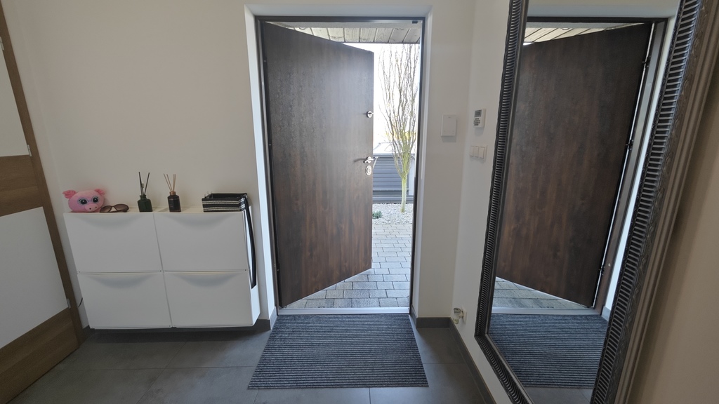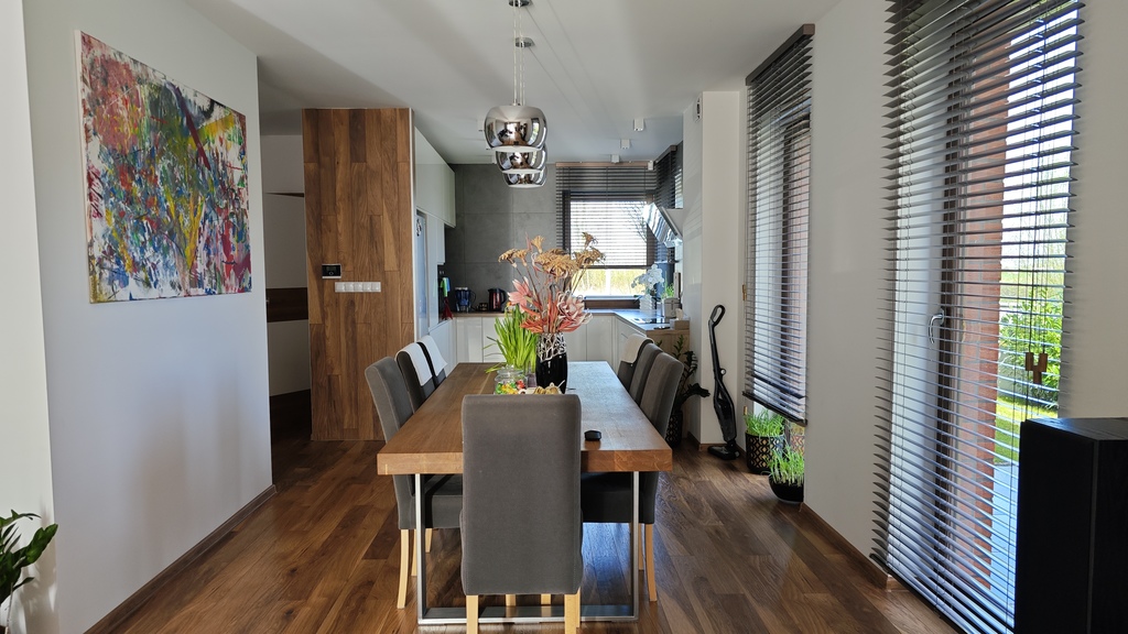 Dom wybudowany został z nowoczesnej technologii przez co jest bardzo energooszczędny. Ściany zewnętrzne - porotherm dryfix plus ocieplenie styropianem grafitowym 15cm oraz tynk silikatowo-silikonowy. Dach - ceramiczna dachówka firmy Braas (glazurowana - bardzo łatwa w utrzymaniu czystości). Instalacja wodna - miedziana. Ogrzewanie i ciepła woda - piec gazowy Vaillant kondensacyjny z zasobnikiem wody (120 litrów). W całym domu ogrzewanie podłogowe (na piętrze każdy pokój sterowany osobno). Bardzo niskie rachunki za gaz na poziomie 320 zł miesięcznie przy czteroosobowej rodzinie. Okna trzyszybowe PCV z okleiną drewnopodobną. We wszystkich oknach żaluzje aluminiowe wewnętrzne. Ogrodzenie domu - murowane obłożone gresem. Brama wjazdowa, furtka na posesję oraz brama na pilota od garażu - wszystko firmy Wiśniowski. Przed garażem dodatkowe miejsce do zaparkowania drugiego samochodu.
