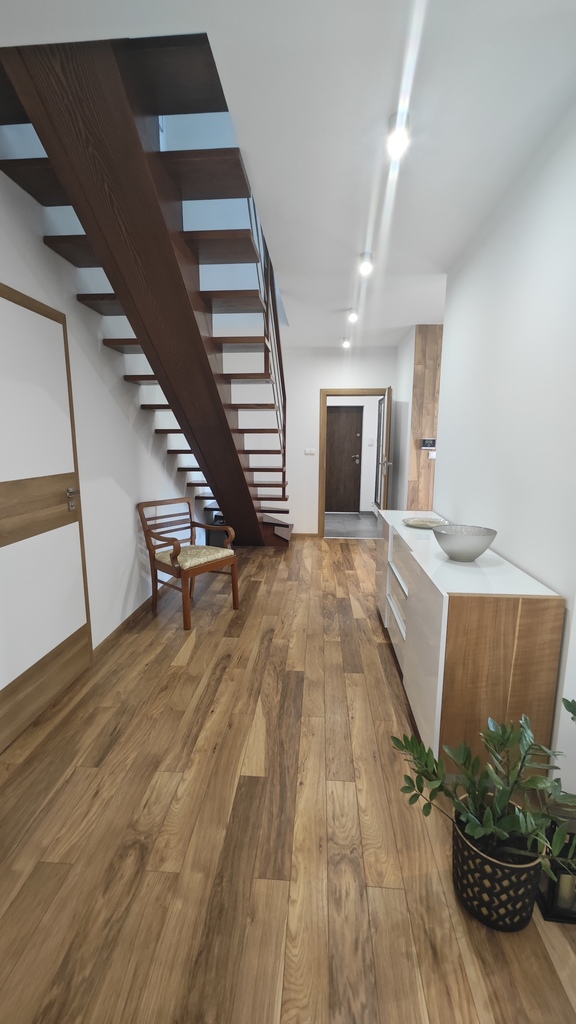 Na piętro prowadzą drewniane, wygodne schody (jesion). Na tym poziomie mamy trzy osobne pokoje (sypialnia 17m2 oraz dwa pokoje po 11m2), łazienkę 9m2 z oknem, pralnię 3,60m2 (również z oknem) oraz hol 9m2. Piętro bez skosów !!!