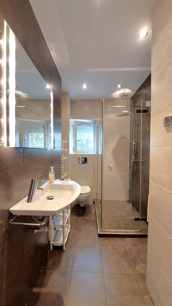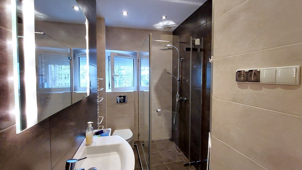 - łazienka z oknem w bardzo nowoczesnej glazurze i terakocie,