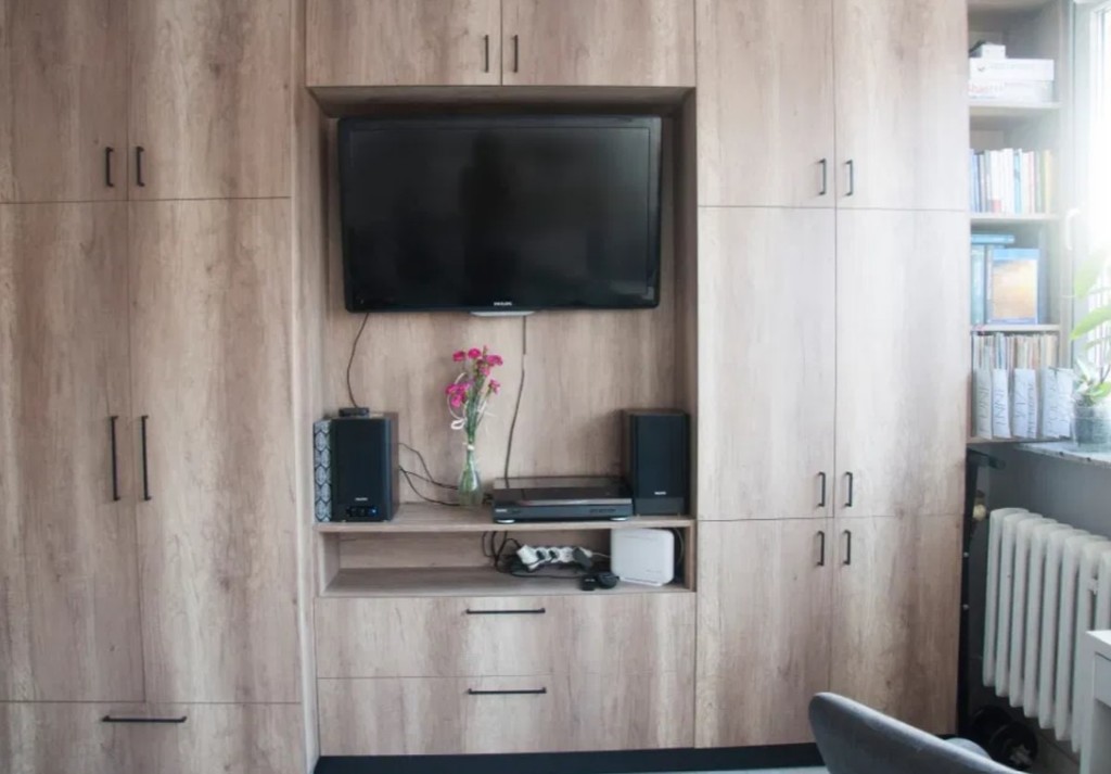 W salonie znajduję się narożnik z funkcją spania, telewizor oraz meble wykonane na wymiar