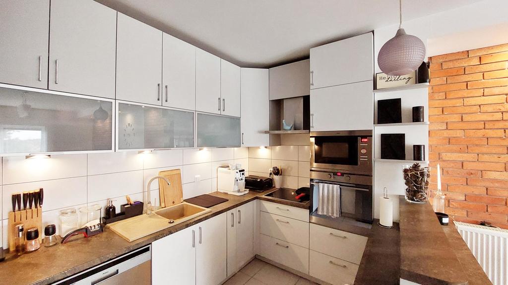 W przedpokoju znajdują się zabudowane szafy. W całości wydzielonej kuchni zamontowane są meble na wymiar, które maksymalizują przestrzeń do przechowywania. W mieszkaniu zamontowano bardzo duże okna balkonowe, dzięki czemu jest ono widne i ciepłe.