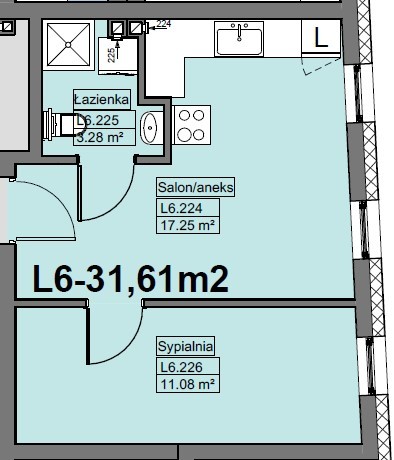 Lokal mieszkalny o pow. użytkowej 31,61 m2 składa się z następujących pomieszczeń: