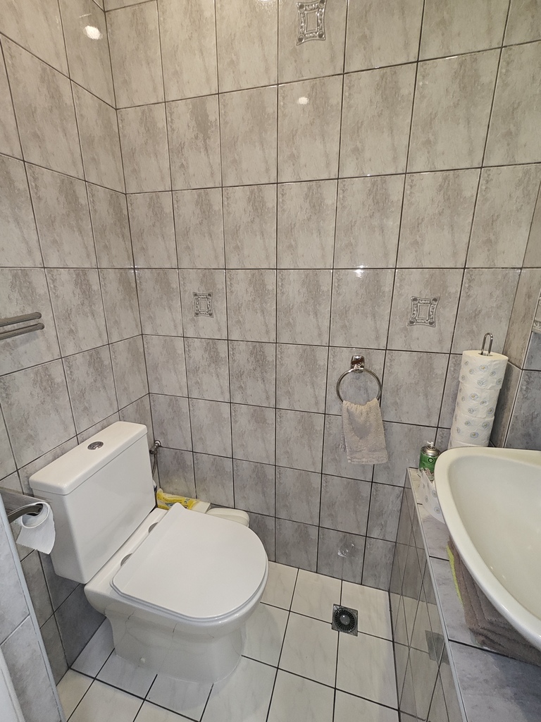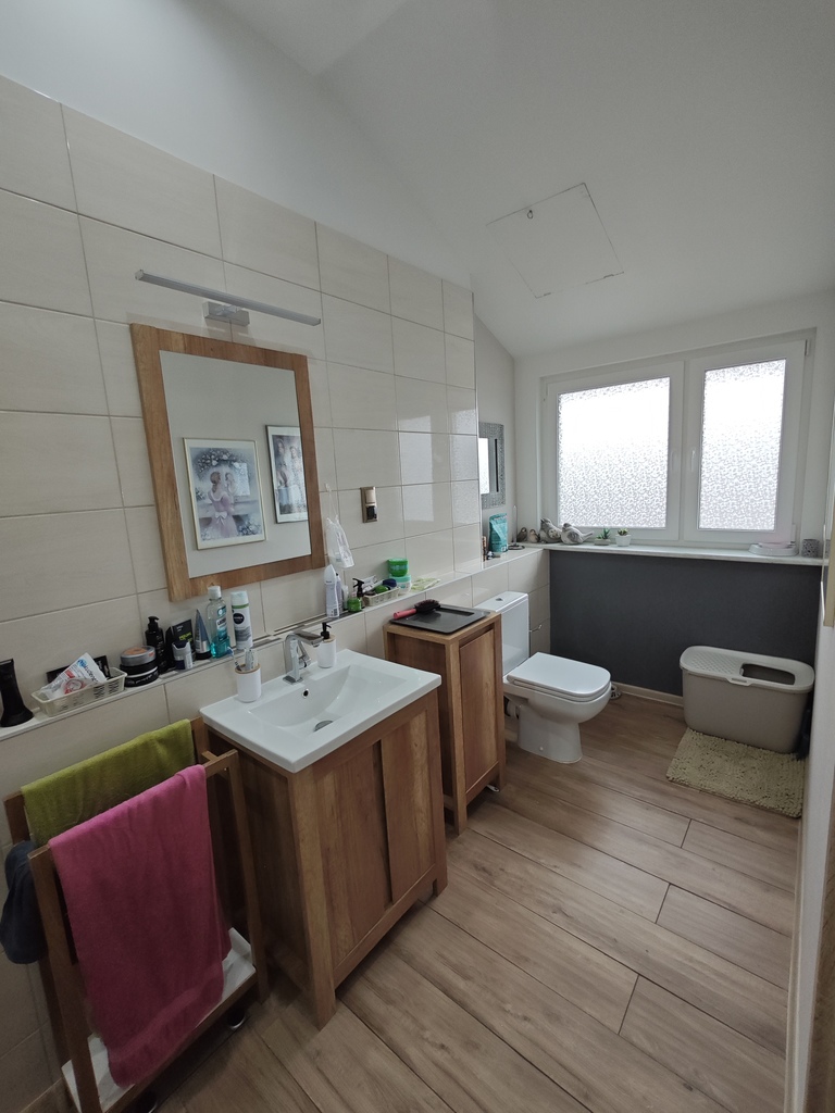 Dom posiada dwie łazienki: jedną z kabiną prysznicową wanną i WC oraz drugą z kabiną prysznicową i wc. Całość utrzymana jest w bardzo dobrym stanie oraz jedną osobną toaletę.