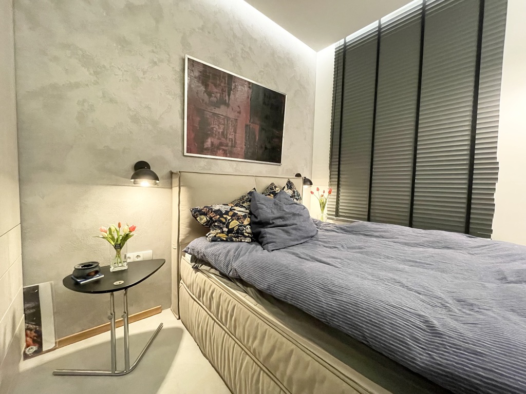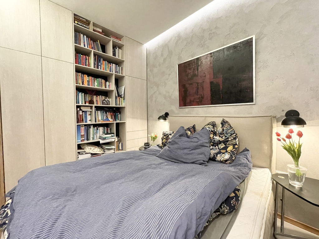 - sypialnia, do której wchodzimy z salonu (wysokie łóżko, szafa z regałami w zabudowie na całej ścianie)