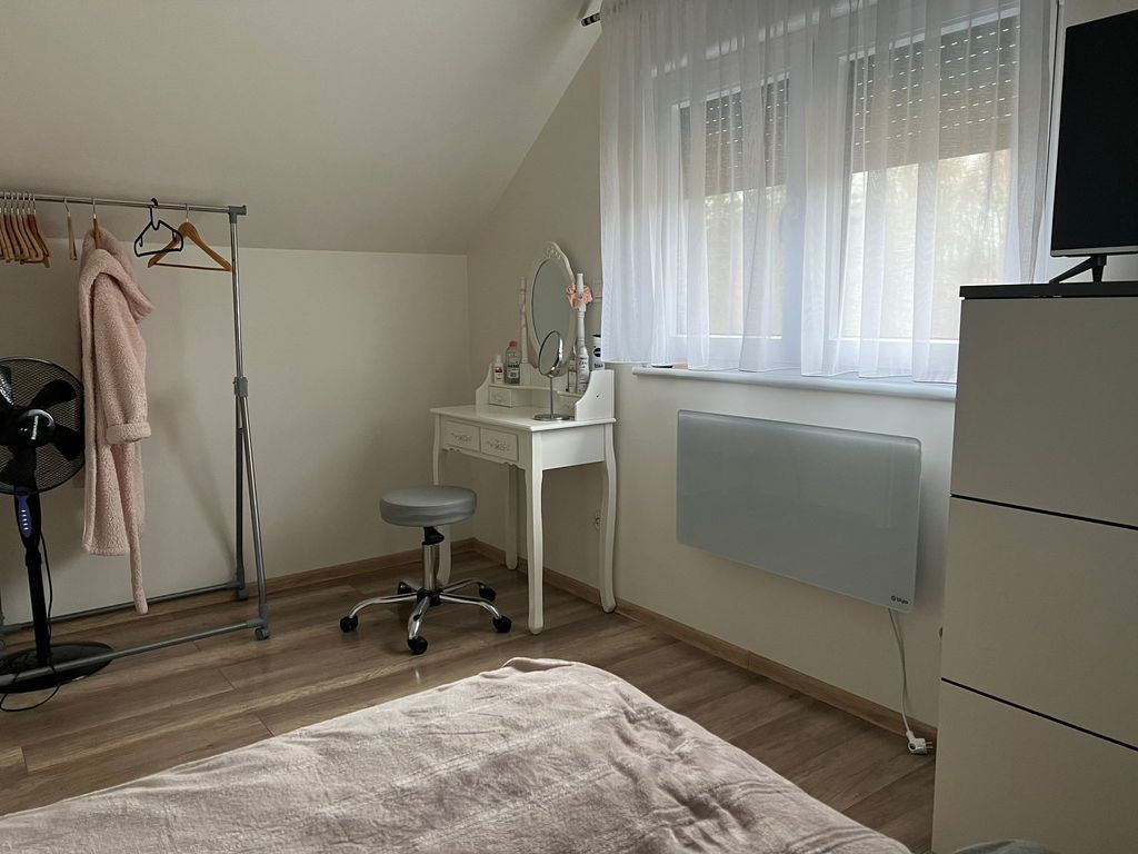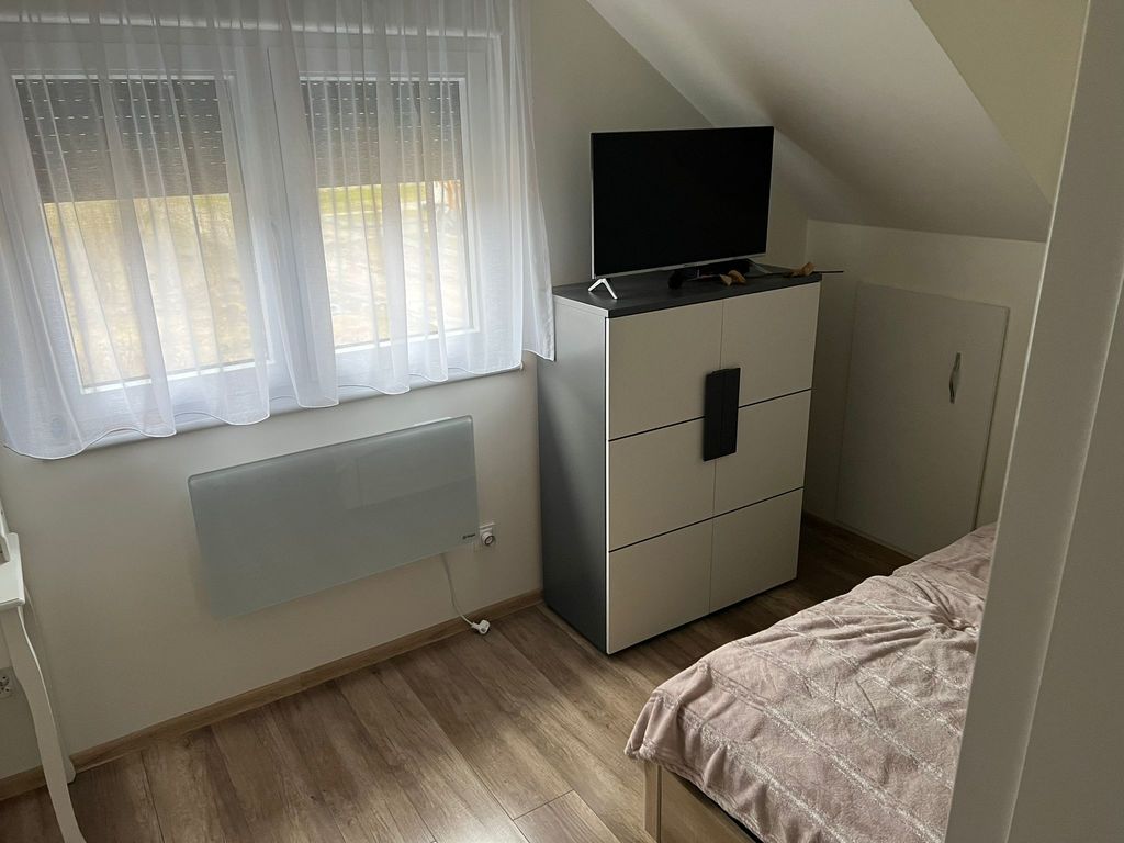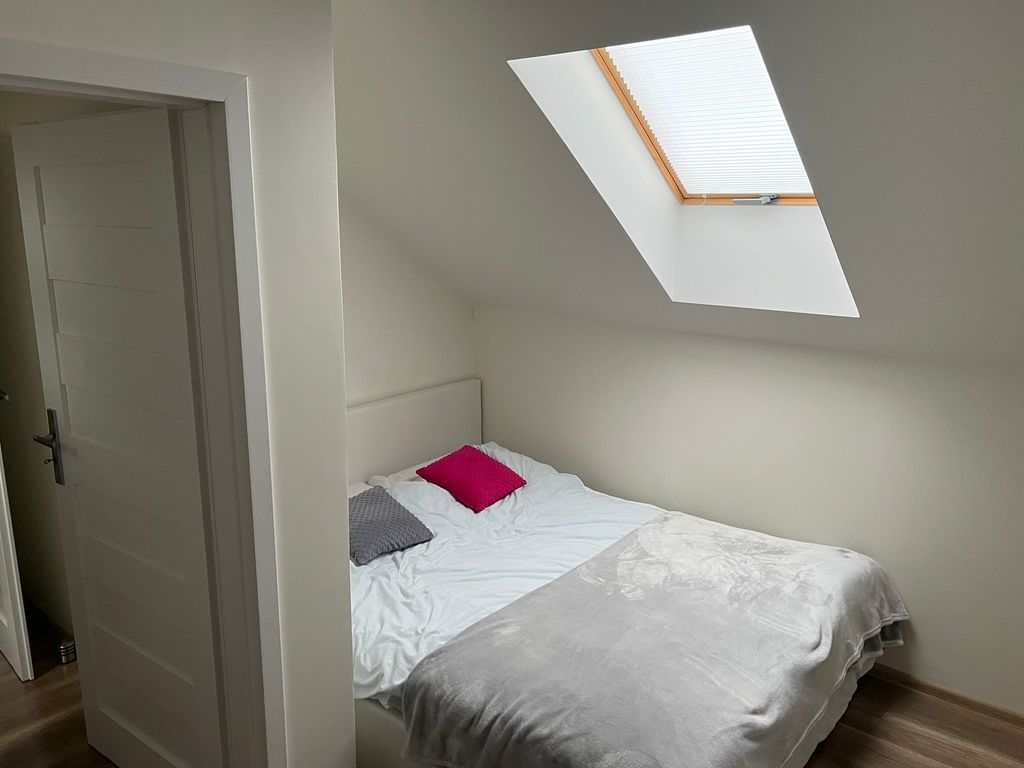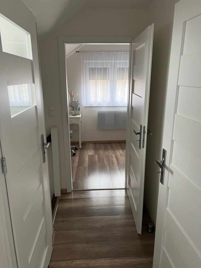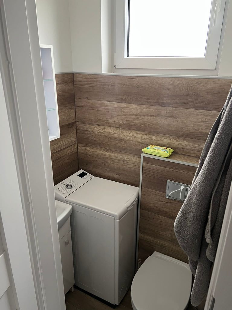Na podłodze panele i terakota. Kuchnia z zabudową na wymiar i sprzętem AGD (lodówka, zmywarka, piekarnik, płyta indukcyjna). Niepodpiwniczony.