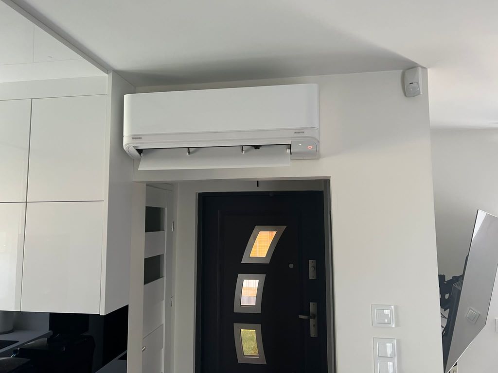 Dom ogrzewany jest pompą ciepła oraz dodatkowo klimatyzacją z funkcją grzania i chłodzenia.