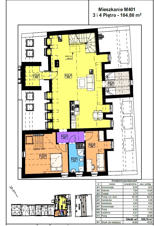 Do sprzedaży lokal mieszkalny II-poziomowy, położony na 3 i 4 piętrze o powierzchni użytkowej 104,80 m2 (całkowita powierzchnia 135, 76 m2). Nad mieszkanie do adaptacji powierzchni strychowa o pow. użytkowej 16,86 m2. Na podaną powierzchnię składają się:
