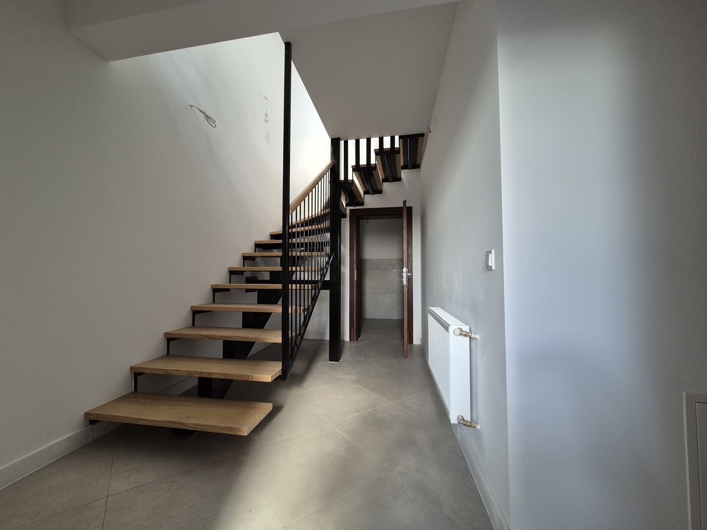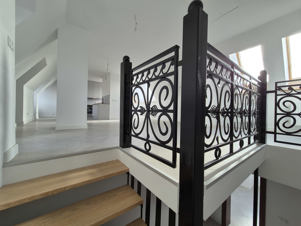 Na piętro prowadzą drewniane schody z pięknymi balustradami wykonanymi z metaloplastyki.