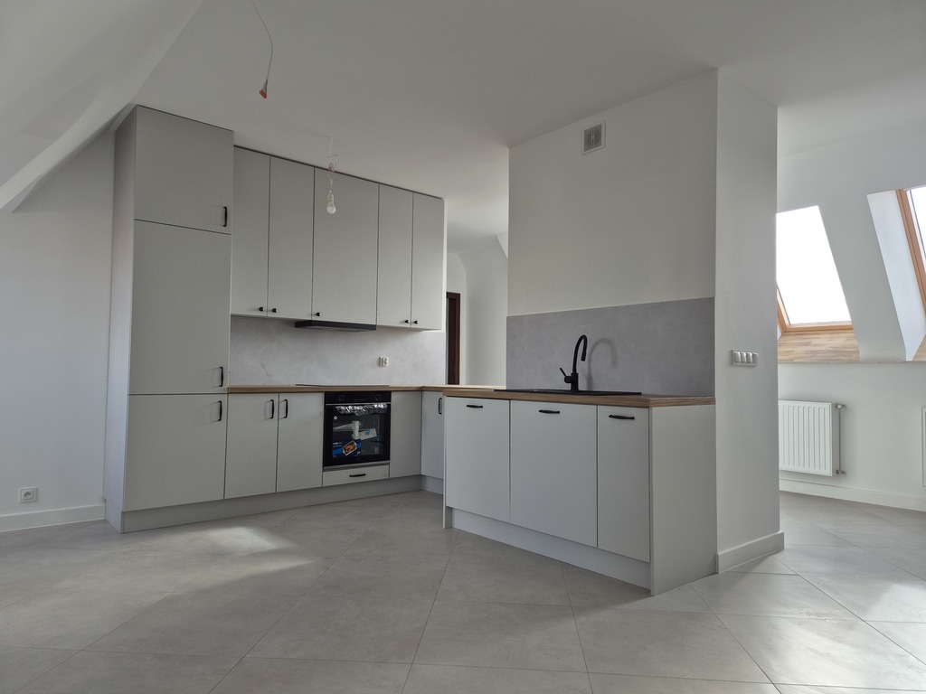 II poziom - przestronny salon z aneksem kuchennym ( 53, 18 m2), dwa pokoje, dwie garderoby, łazienka, komunikacja.